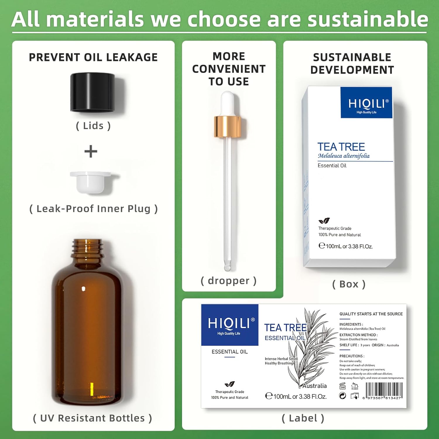 HIQILI Tea Tree Essential Oil (100ml), 100% Pure Natural Therapeutic Grade, Premium Grade Glass Dropper for Toenail Fungus, Hair, Scalp, Skin, Add to Aromatherapy, Diffuser, Humidifier
