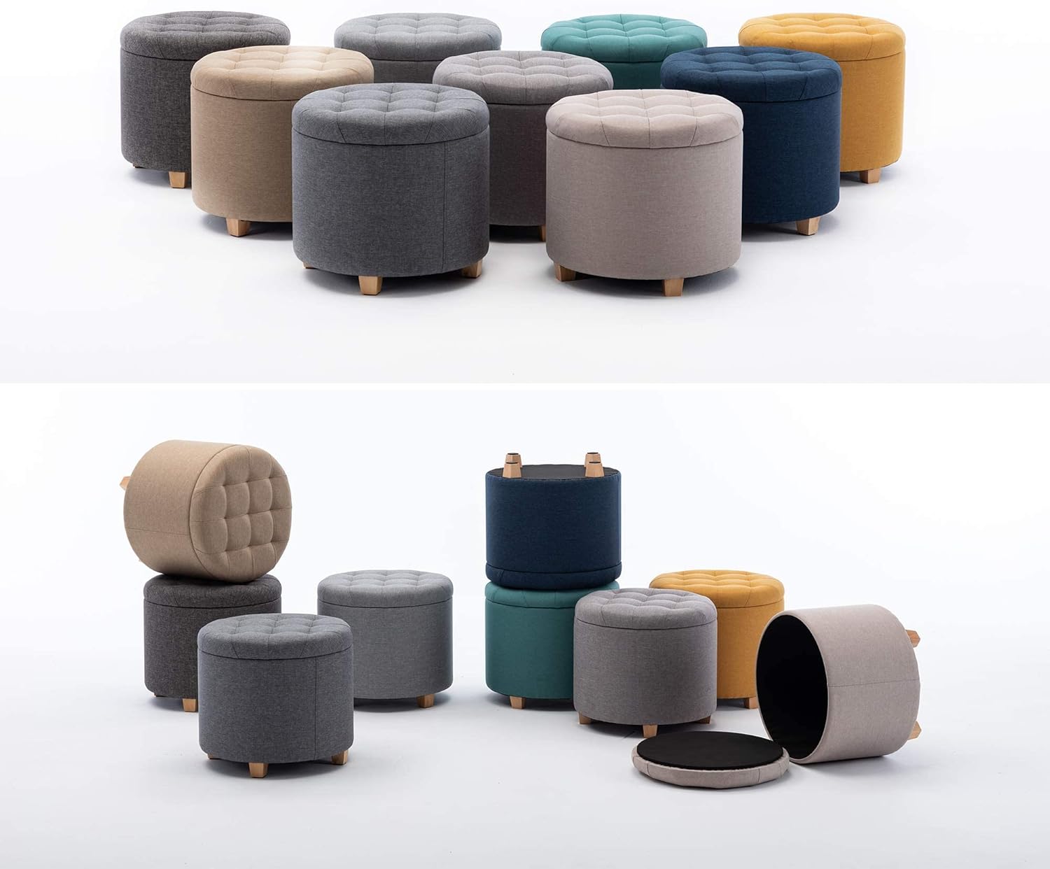 HNNHOME 45cm Round Linen Padded Seat Ottoman Storage Stool Box, Footstool Pouffes Chair with Lids (Yellow)