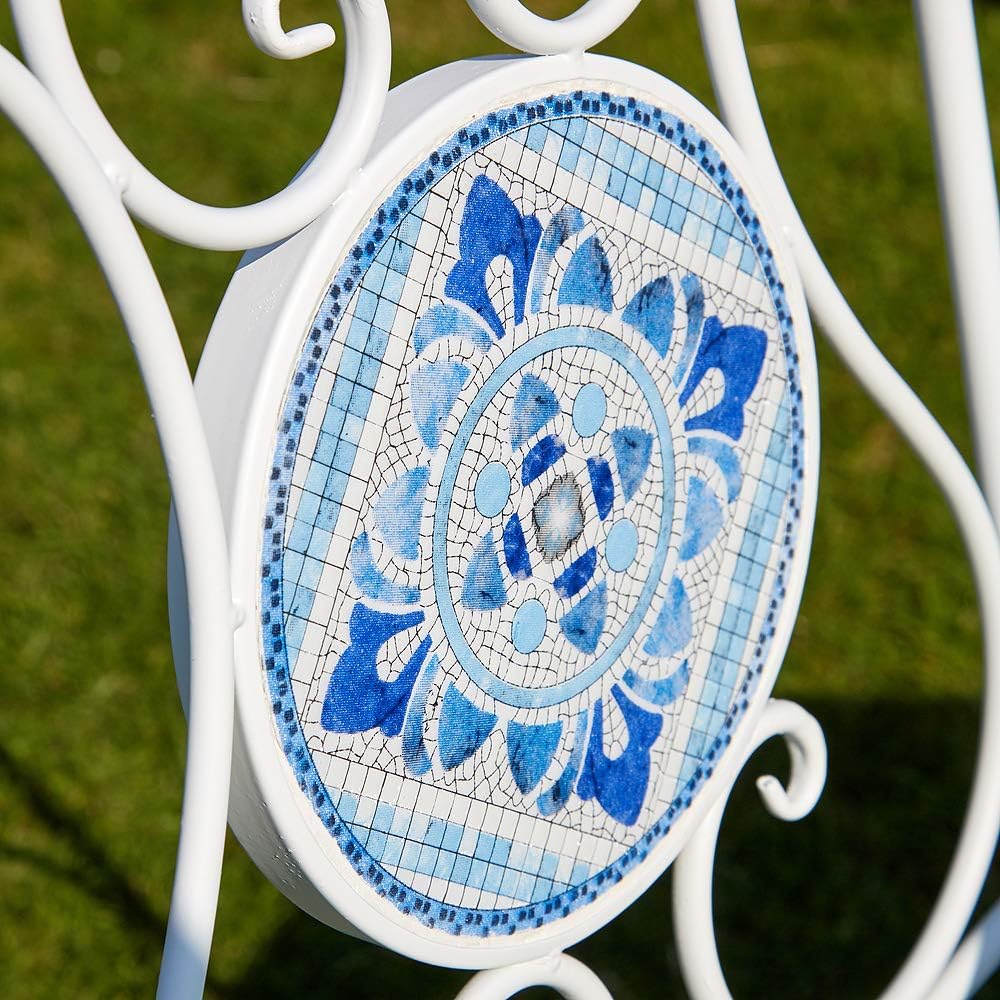 DURABLE: Beautifully crafted from strong, quality metalwork with ornamental scrolling and a protective weather-resistant paint. The table top and back of the chair are inlaid with genuine mosaic pieces in blue and white in a charming traditional pattern.