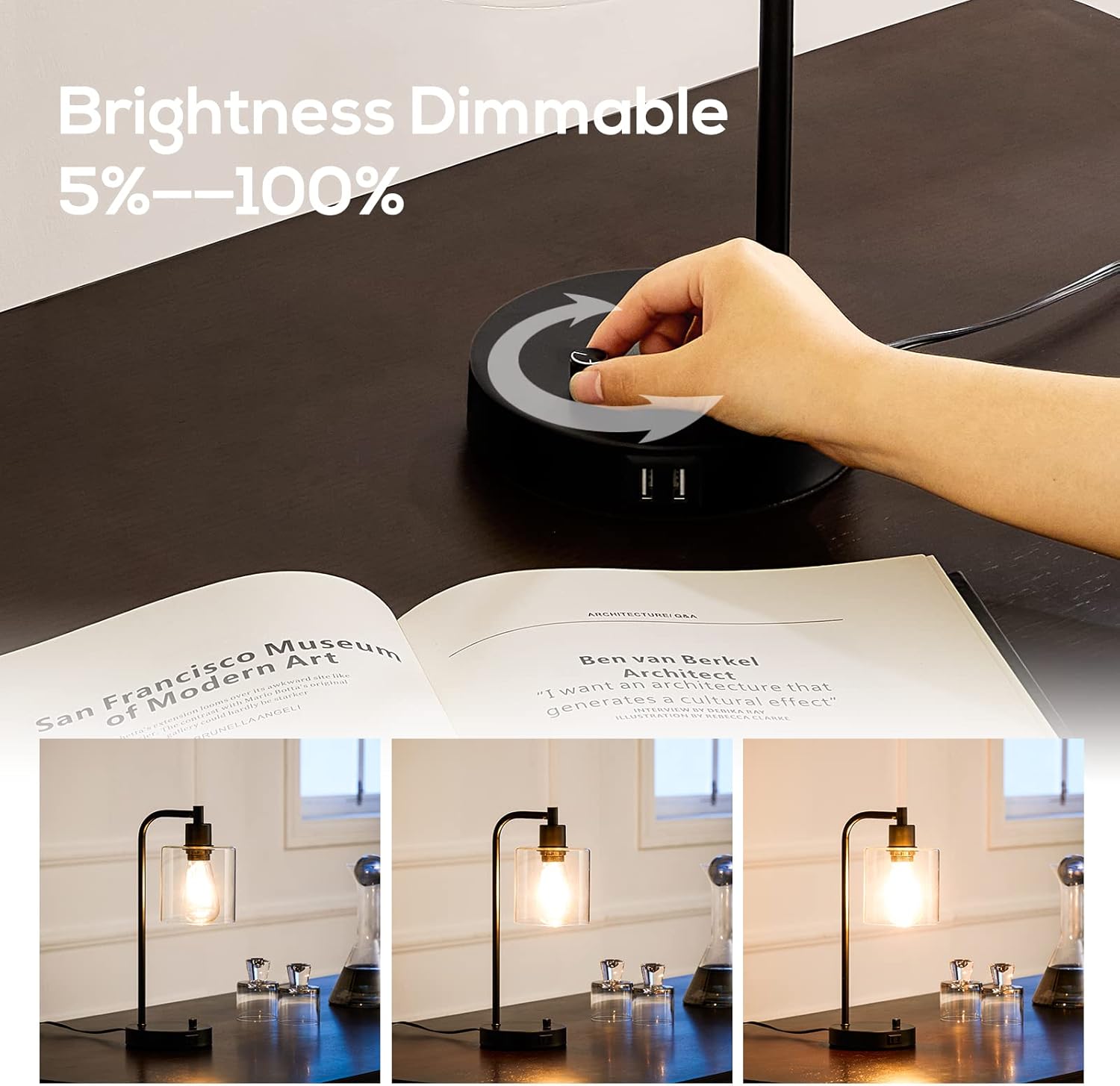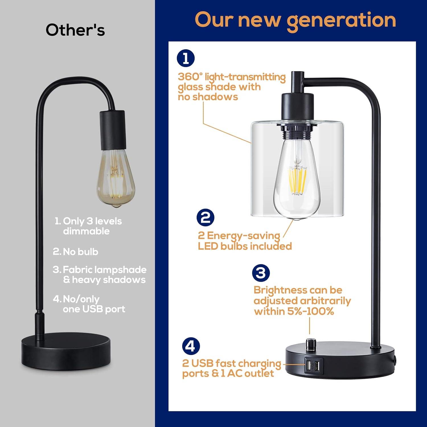 Homelist Dimmable Bedside lamps Set of 2,Industrial retro with USB Charging Ports,Black Modern LED Nightstand Desk Beside Table Lamps,Glass Shade for Bedroom Living Room Home Office, Bulb Included