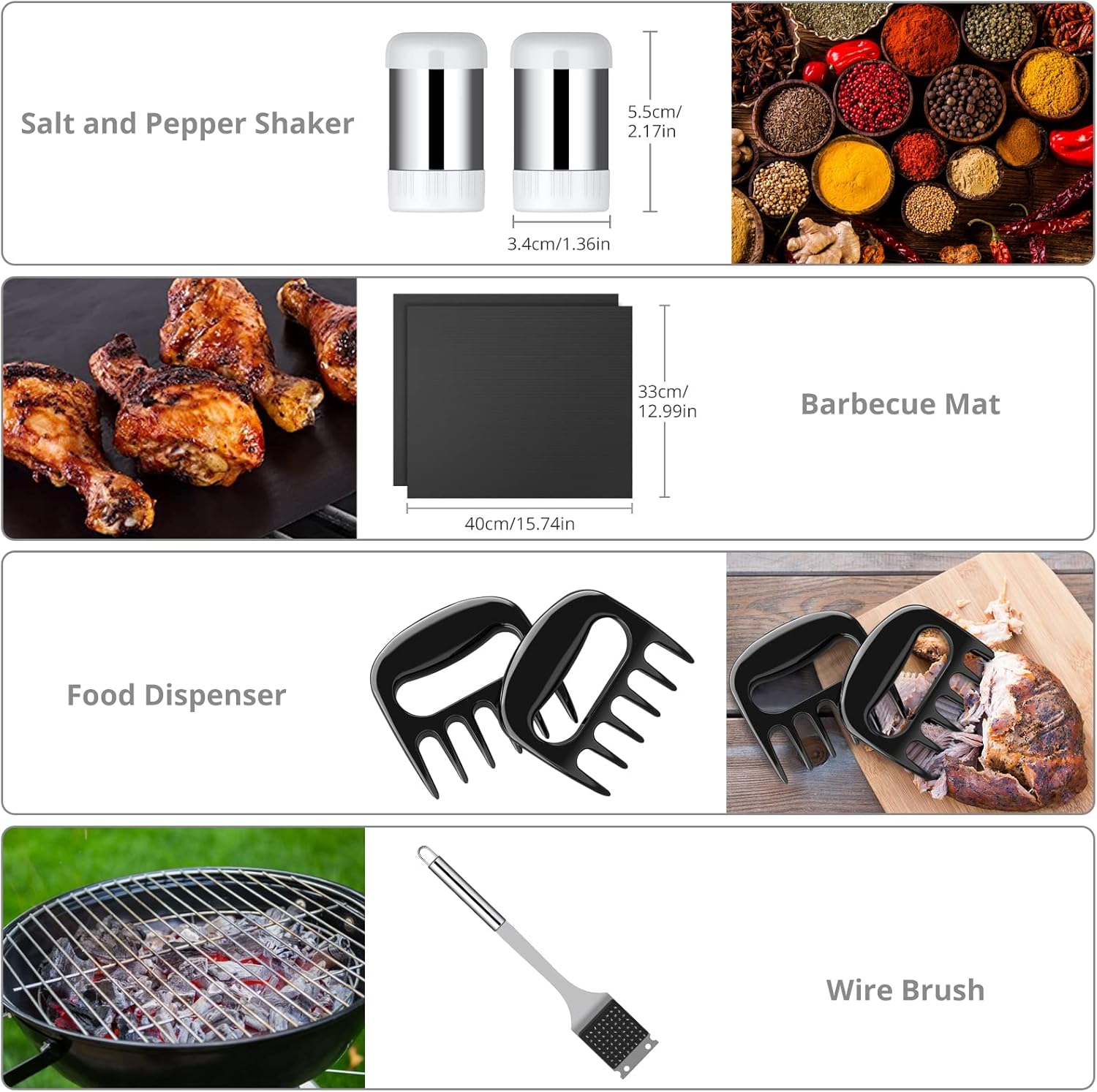 *𝐌𝐮𝐥𝐭𝐢𝐩𝐥𝐞 𝐀𝐜𝐜𝐞𝐬𝐬𝐨𝐫𝐢𝐞𝐬 𝐌𝐚𝐭𝐜𝐡 𝐕𝐚𝐫𝐢𝐨𝐮𝐬 𝐍𝐞𝐞𝐝𝐬*—-: Our HOMGEN Barbecue Accessories Tool KitContains all the Tools you Need for Grilling, Including: 1xSoft Barbecue Brush (13.6 inches), 1x Barbecue Clip (13.8 inches), 1x Barbecue Fork (13.8 inches) ), 1x Grill Shovel (13.8 inches), 8x Corn Racks (2.6 inches), 7x Stainless Steel Grill Rods (14.2 inches), 1x Wire Brush (13.4 inches),2 x Grill Mat, 2 x Salt and Pepper Shakers , 1 x Storage Bag and 2 X Dispensers.