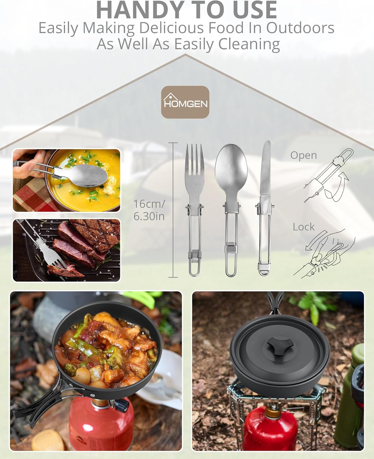 *𝐄𝐟𝐟𝐨𝐫𝐭𝐥𝐞𝐬𝐬 𝐂𝐥𝐞𝐚𝐧 𝐮𝐩*—-: The HOMGEN Camping Cooking Equipment Utensils Set is easy to Clean. Backpacking Camping Frying Pans and Pots for Open Fire Featured with Smooth Coating Ensures Easy Cooking and Cleaning, Foldable Stainless Steel Cutlery even can be Cleaned by Wet Wiping.