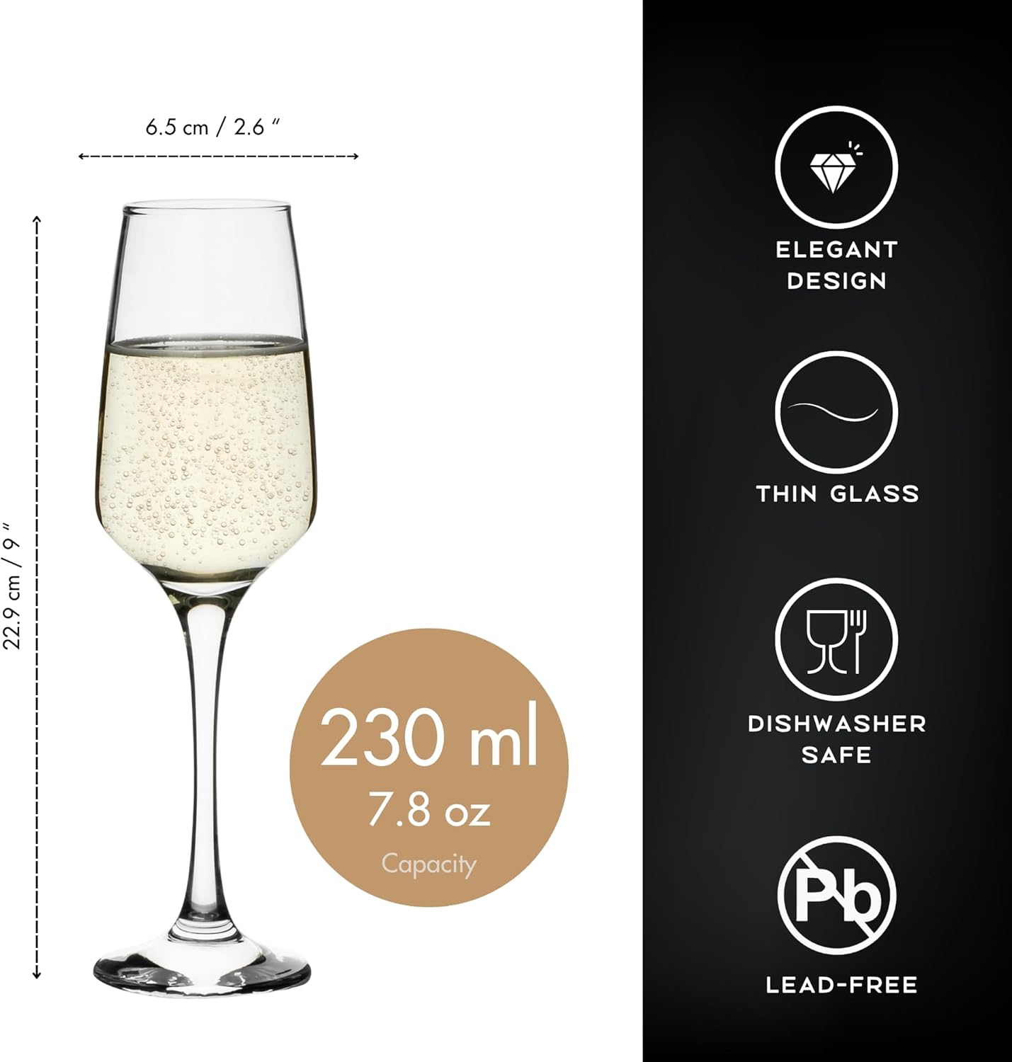 FLORENCE GLASSWARE – Each pack contains six beautifully crafted Homiu Champagne glasses. Each flute stands 22.9cm high, with a maximum diameter of 6.5cm. The capacity is 230ml (7.8 US fl oz). Perfect for parties, celebrations and wine-tasting events. The Florence Glassware collection is a coordinated range which includes white wine glasses, red wine glasses, Champagne flutes, whiskey glasses and tall tumblers