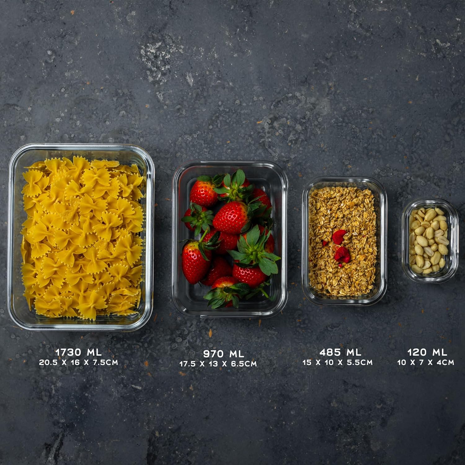 MEAL PREP GLASS CONTAINERS REUSABLE: Homiu 4 storage boxes with lids come in various sizes. Large food storage container comes in 1730ml, 970ml, 485ml &120ml containers. Use the kitchen storage containers for storing, freezing, reheating & serving. Ideal for baby food storage, leftovers, packing snacks, air fryers or use as a salad lunch box for taking lunch on the go & picnics.