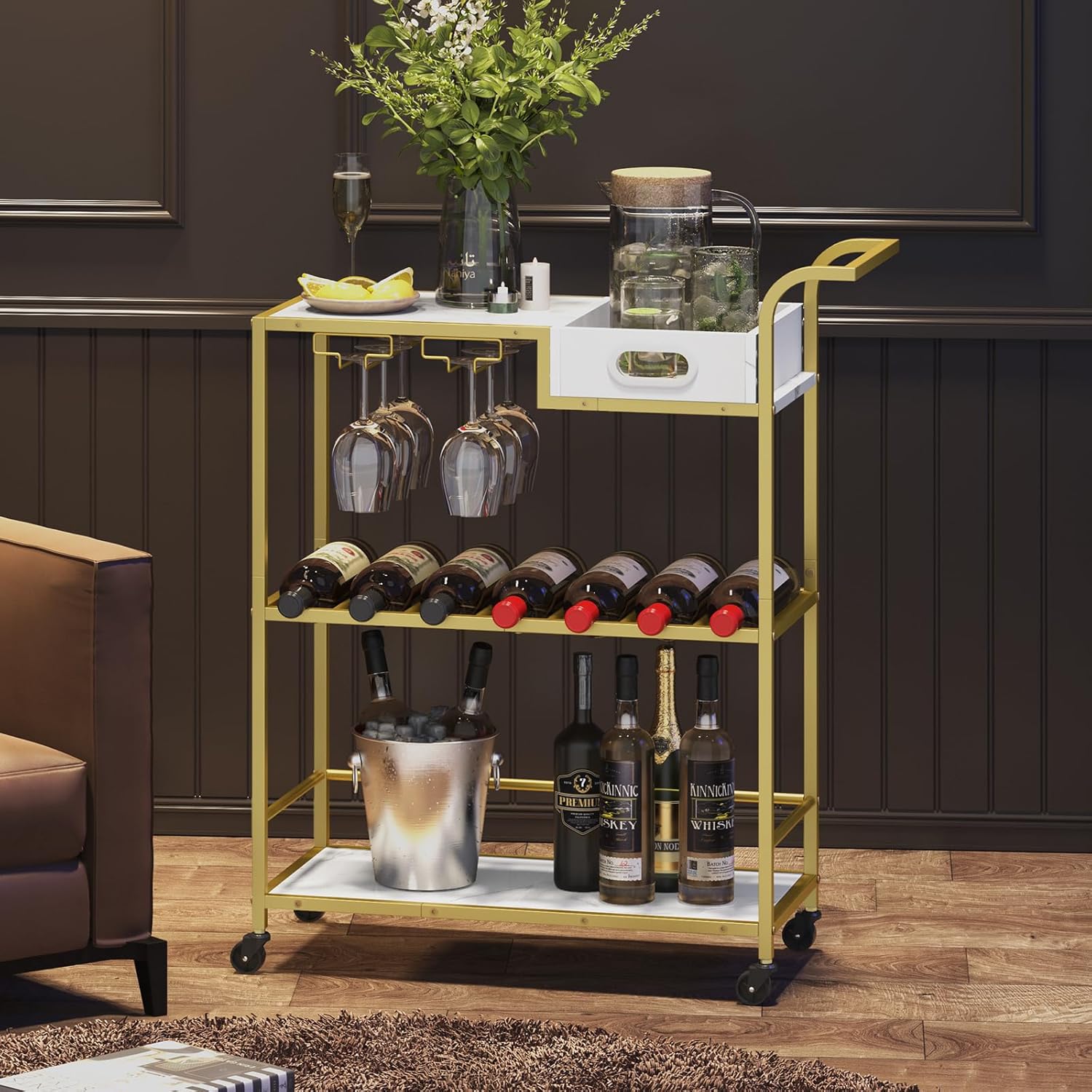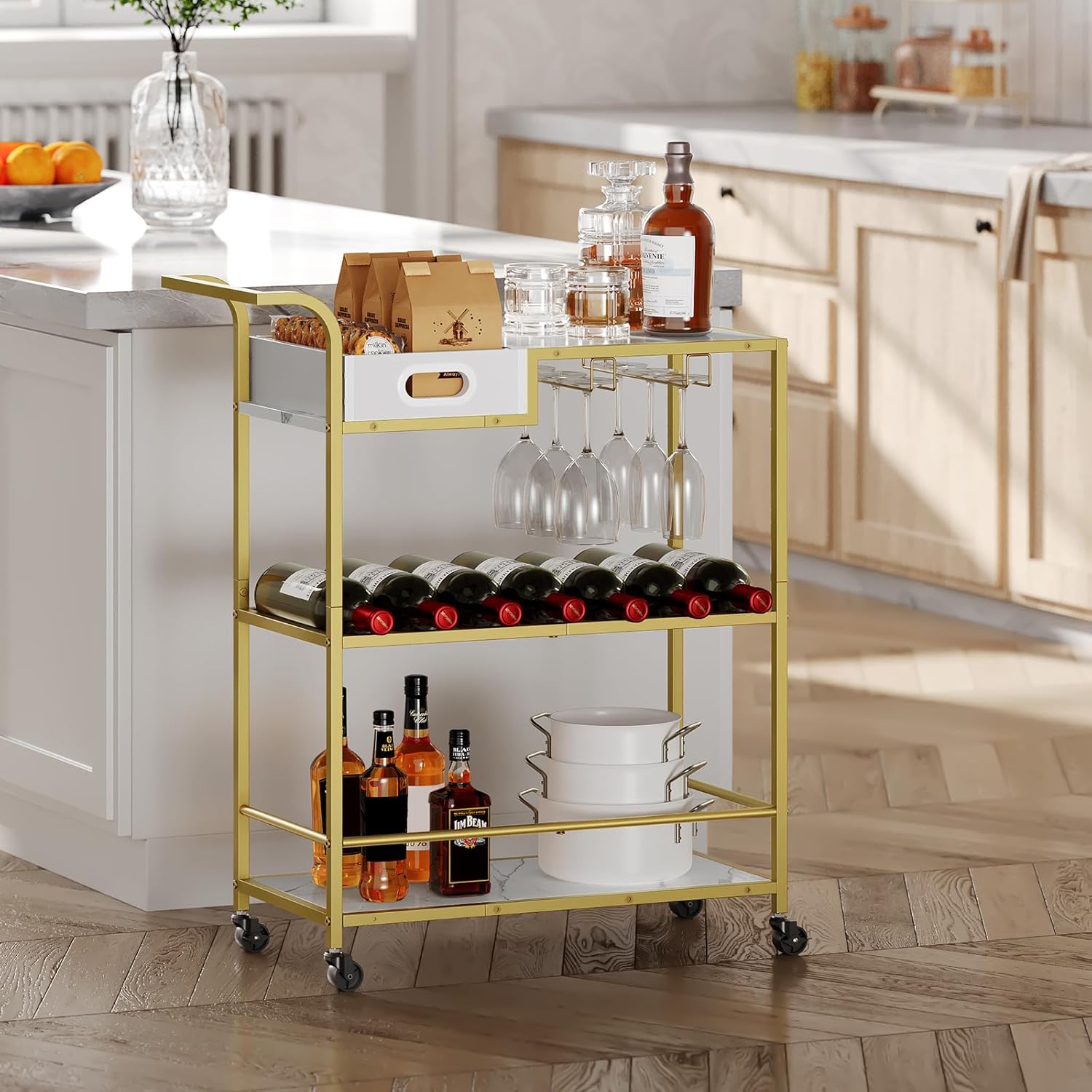 Elegant marble white finish with a golden frame, a tasteful choice for any occasion.Versatile as a kitchen trolley, party beverage cart, or bar cart, bringing unmatched convenience.