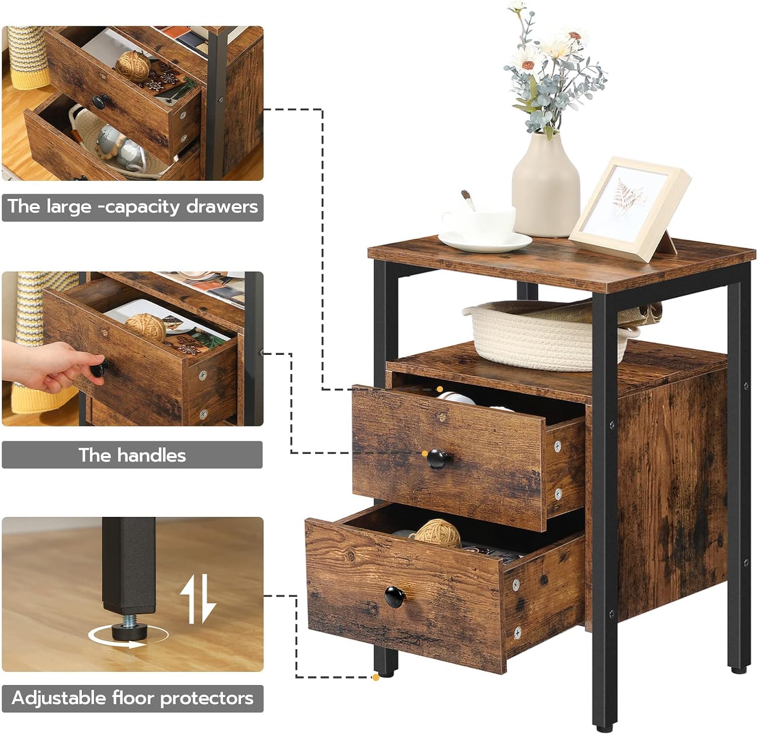 Solid As A Rock: Particle board and metal frame make the bedside table sturdy and resistant. 4 adjustable feet included not only increase its inherent stability, but also protect the floor from being scratched