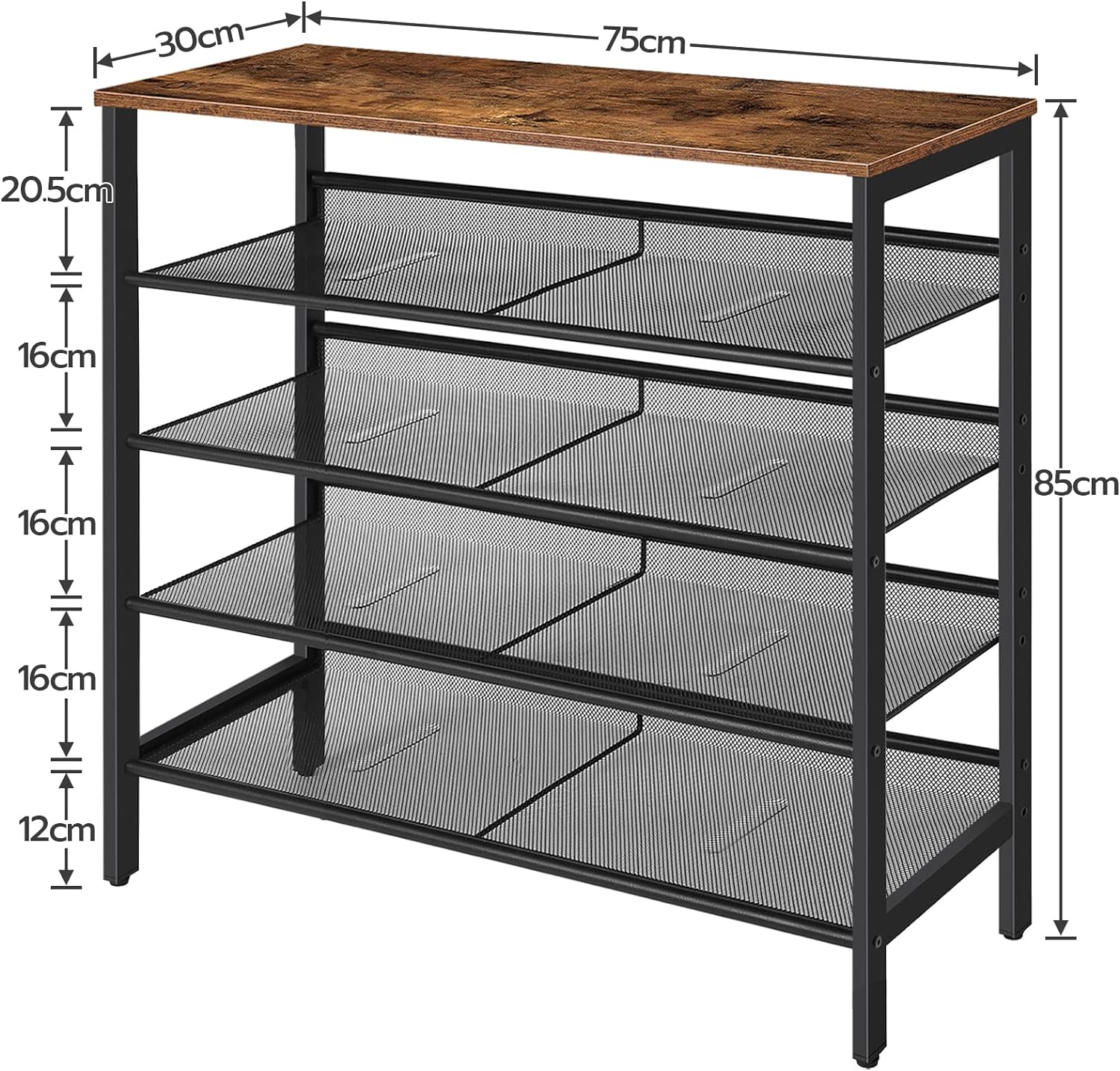 Color Rustic Brown, Black Material Particleboard and Metal Product Size 75 x 30 x 85 cm (L x W x H) Weight 6.3 kg Package Contents 1 x Shoe Rack;1 x Accessory Kit; 1 x Instructions HOOBRO Notes Children are not allowed to climb on the shoe rack.