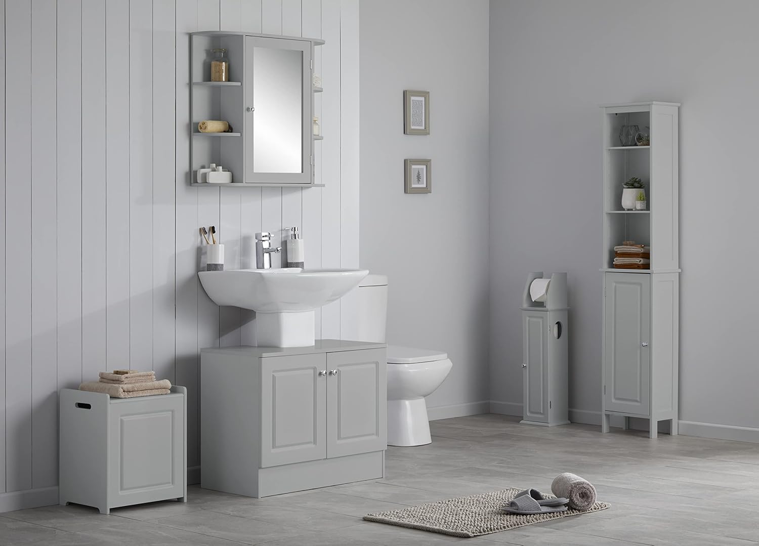 This clever grey under sink storage unit is ideal for creating extra storage space in your bathroom, en suite, downstairs toilet or utility room. It’s the perfect floor standing vanity unit to finish off the look of your room, whilst creating additional storage space for all your bathroom essentials, toilet rolls and cleaning products.