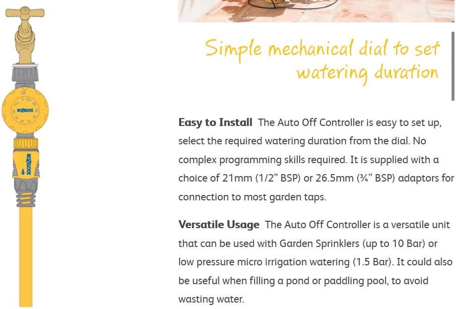 The Hozelock Auto Off Controller is simple egg timer type device that allows you to select a watering duration of up to 120 minutes, automatically switching off afterwards.