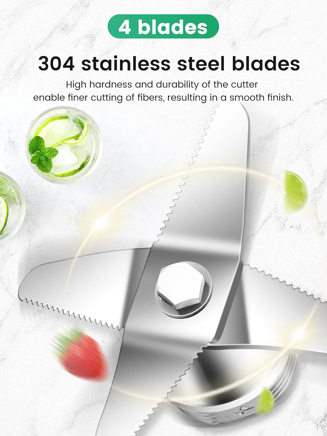 【304 Stainless Steel Hardened Blades】The blender uses hardened 304 stainless steel 4-leaf blades that crush the ingredients multi-dimensionally, squeezing through the cell wall, making food softer and smoother and preserving the nutrients.
