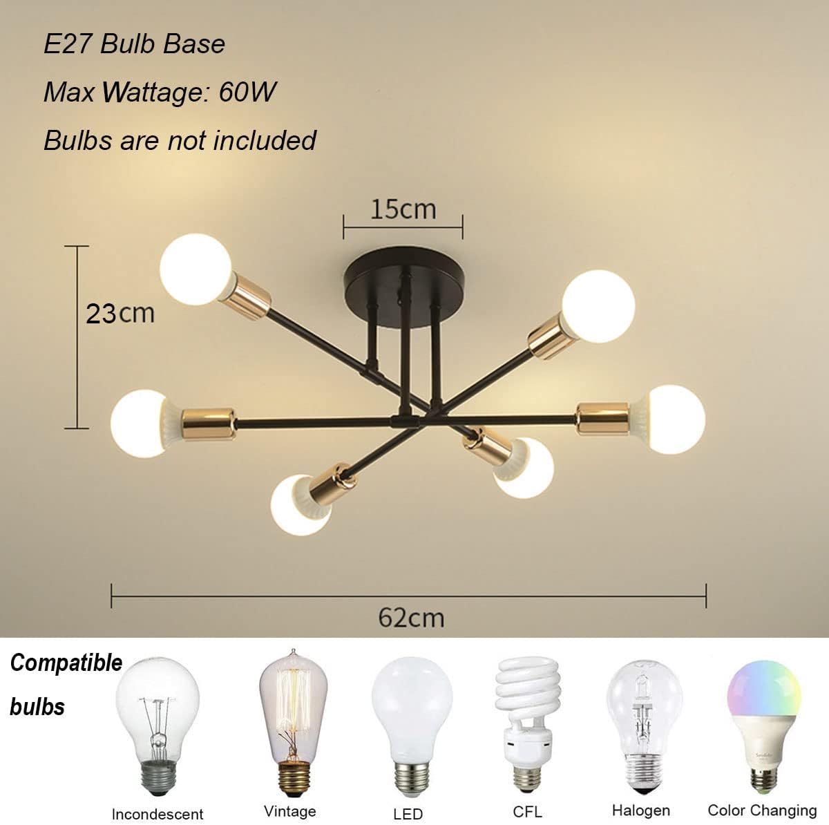 Bulb Type: LED/CFL/Edison bulb is available,6 x E27 bulb sockets, Max 60W per bulb, AC110-240V. (Bulbs NOT included)