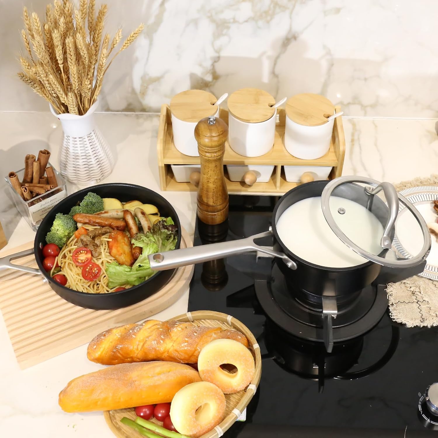 🍲【POTS AND PANS SET INCLUDES]】24 cm frying pans; 1.5 L saucepans with lids; 3 L stock pot with lid; total 5pcs included, meets all daily cooking needs in the kitchen.