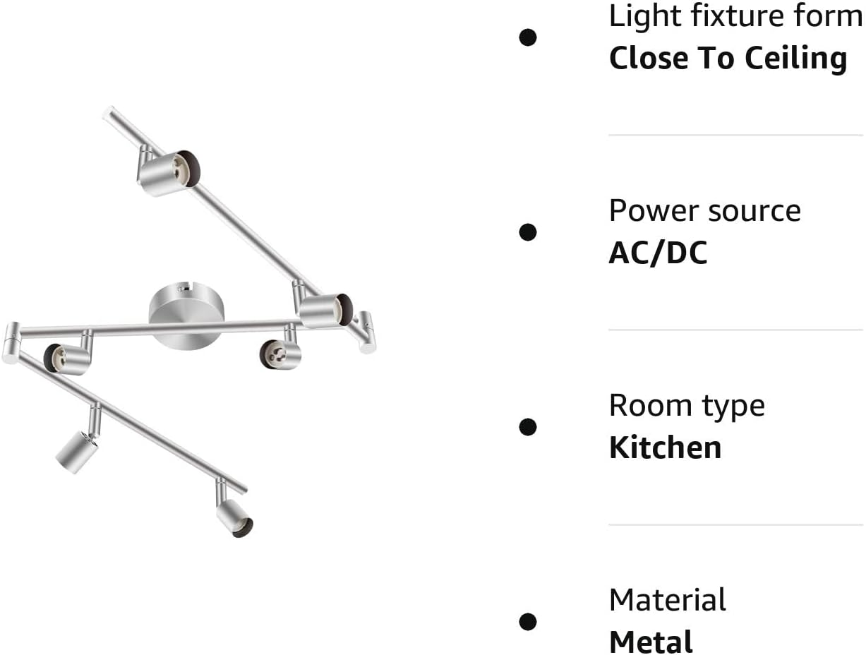 Swivelling Design Spotlight: Our 6-way Ceiling spot light can be rotated 270 degrees. With 6 swiveling short lamp arms, the ceiling light can be rotated 270 degrees; With 6 adjustable light bases,the track lighting kits can be swung 90 degrees upside down.
