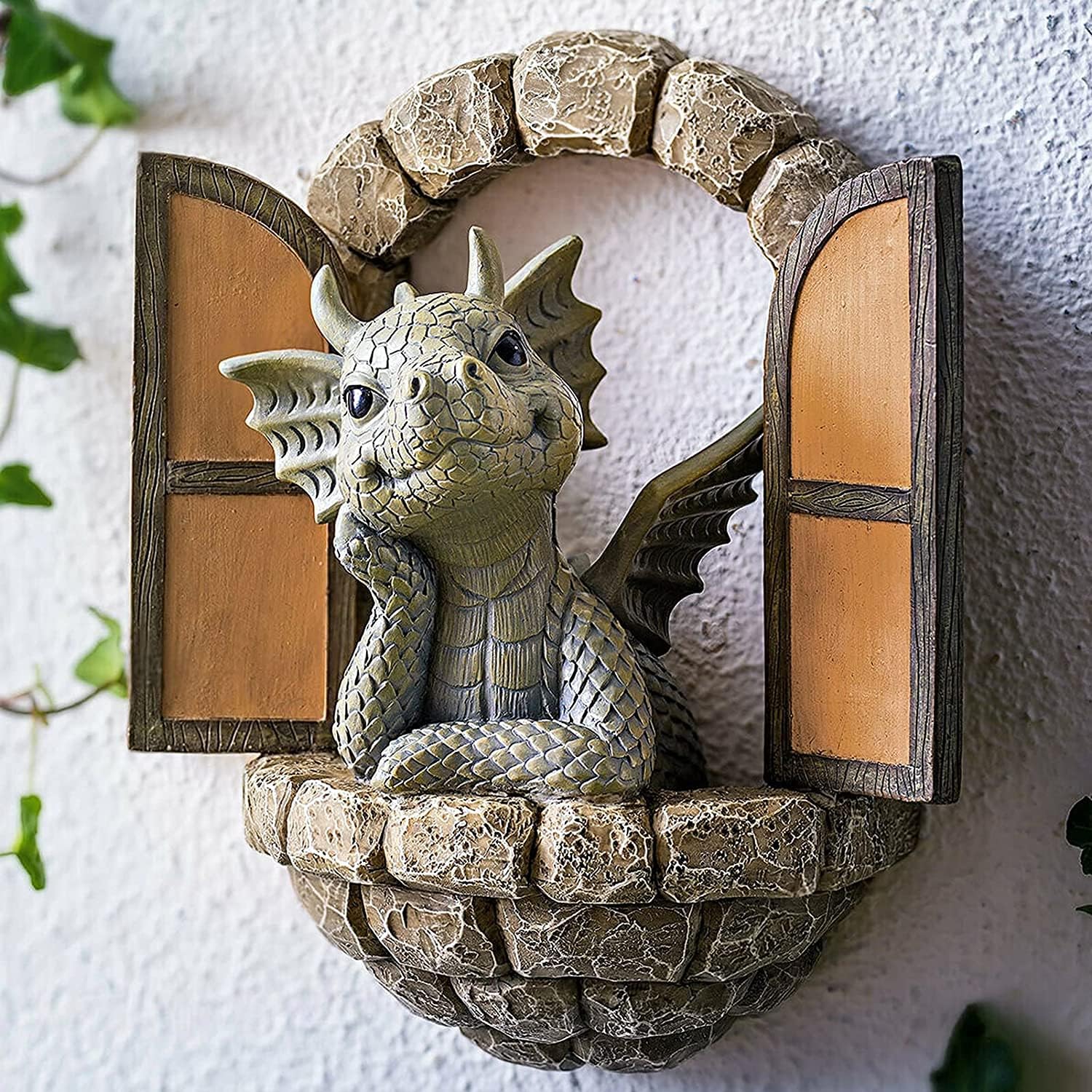 Unique Dragon Design Combine with Modern Life:This little dragon lady who has made herself comfortable on a window ledge is a great wall decoration. To bring a smile to all who see it. Nice for a wall of the garden shed or a tree trunk, for example. Dragon statue design combines dinosaurs with our modern life as well, So cute little dragon peeping out of his front door with the unreal solar lanterns.as if they live in the same world as us, We are the neighbors!