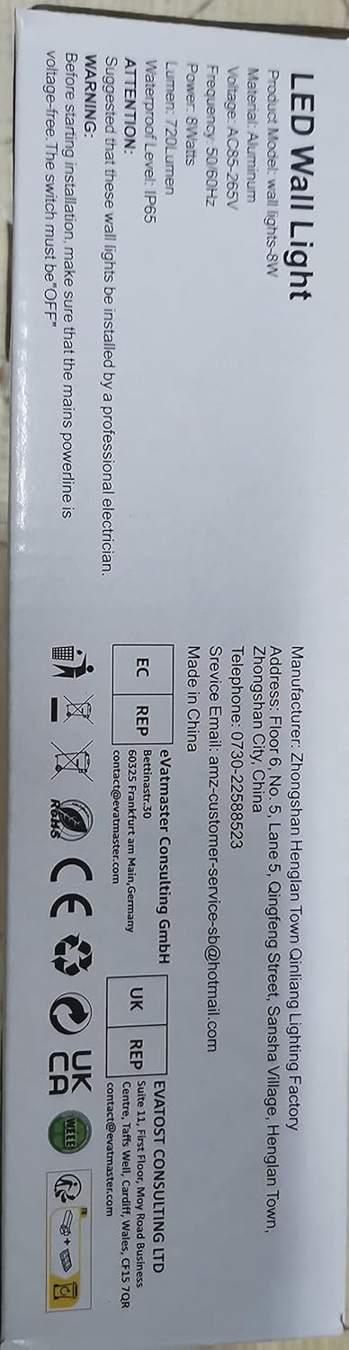 Material: AluminumPower: 8 Watts Lumens: 80-90LED Life: 50,000 hours Beam: Up and Down Light Color Temprature: warm white 3050-3250K Waterproof: IP65 Rated Voltage: 85-265VDimensions: approx L16.9* W4 * H8 cm Input: AC100-240V 50/60HZ