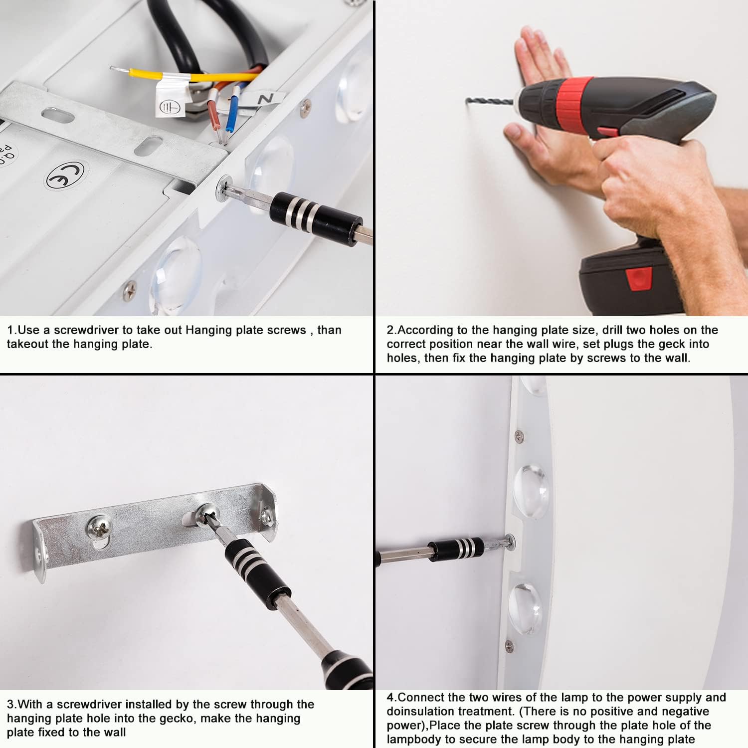 Release two screws of the hanging plate on both sides, take out the hanging plate.According to the hanging plate size, drill two holes on the correct position near the wall wire, fill the included gelatin nail into the hole and secure the bracket with screws.Connect the power leads to wall wire and do insulation treatment.Fix the lamp fixture on the hanging plate by screwing screws tightly on both sides.