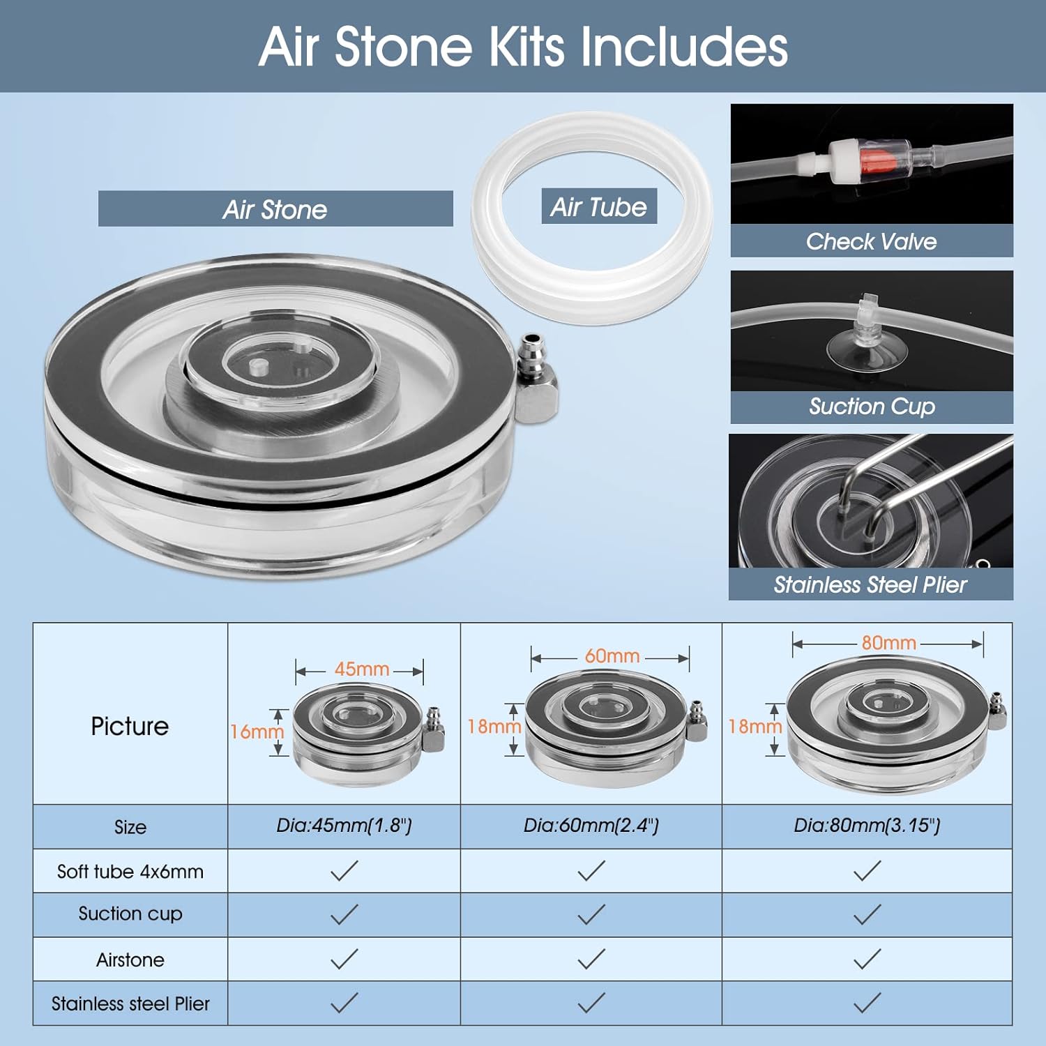 ✨【Package Included】Includes a 1.8-inch(45mm) air stone, 1 air tube 2m, 1 suction cup, 1 stainless steel pliers. It is driven by 2W or larger wattage air pump. The air volume can be adjusted by rotating the air stone. Different oxidation amount to meet different use requirements.