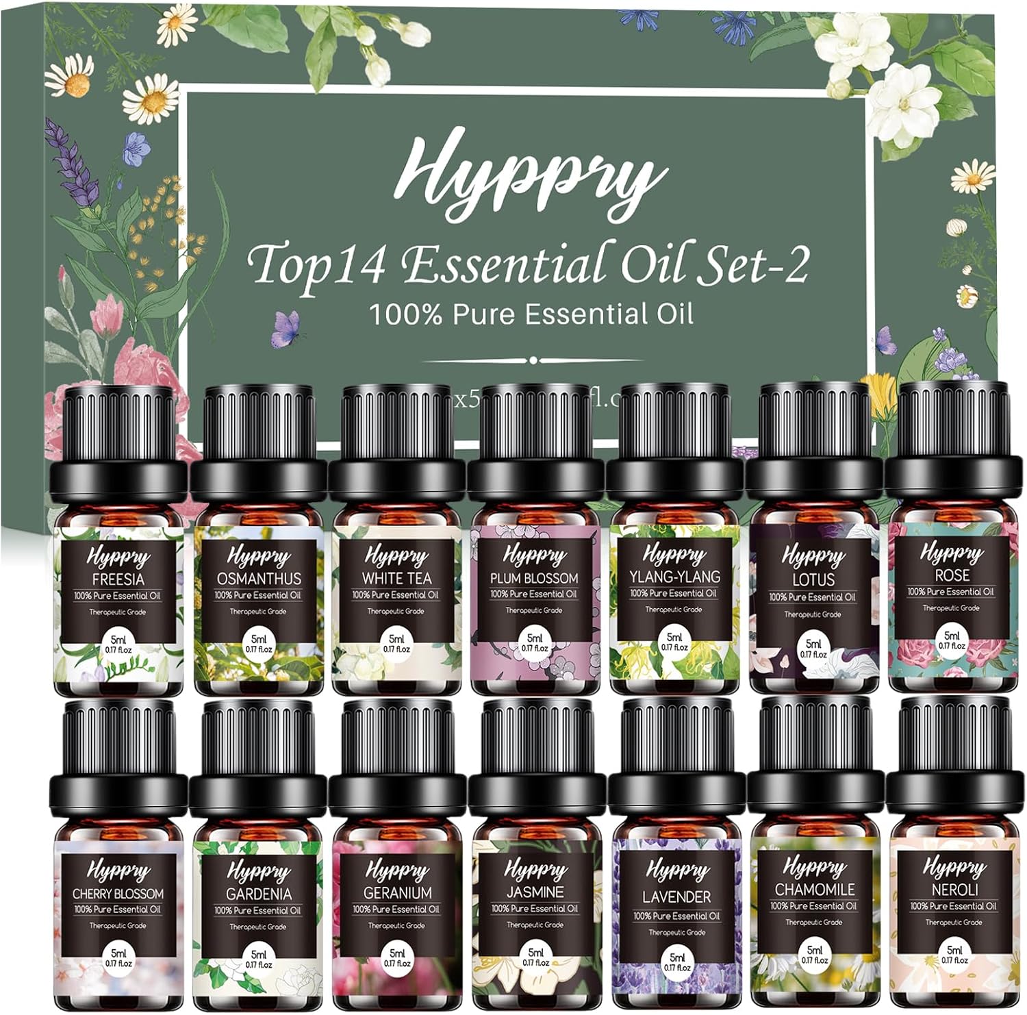 Hyppry Floral Essential Oils Fragrance Oils Set 14 X 5 Ml, Premium Aromatherapy Scented Oils For Diffusers For Home Lavender, Rose, Freesia, Ylang Ylang, Jasmine, Chamomile, Neroli, Cherry Blossom