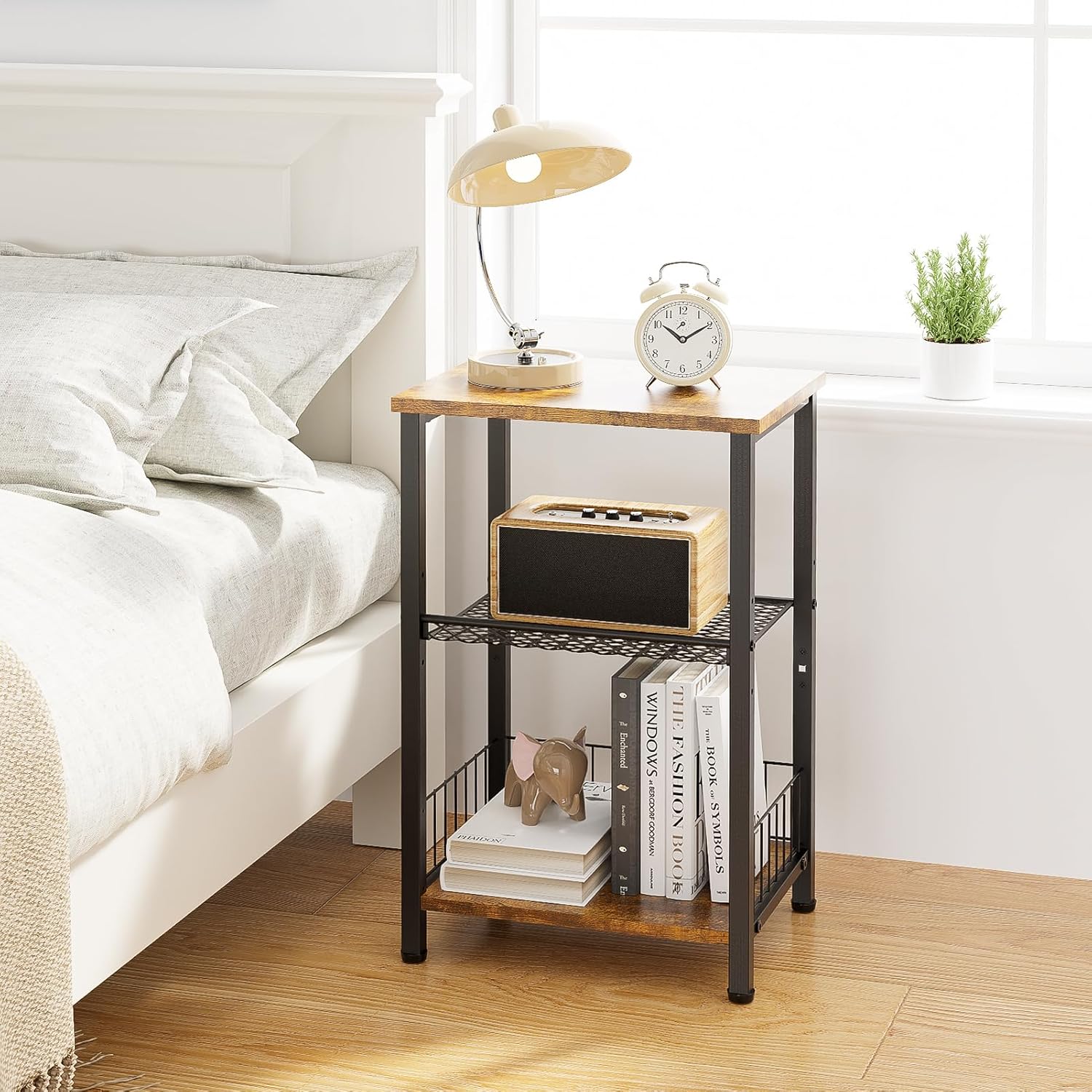 【Vintage Industrial Style】Our side table adopts premium wooden board in warm retro color and trendy mesh element, which can be perfectly integrated into any home style; This end table has a simple, vintage design that blends in with most decors and makes an deep impression.