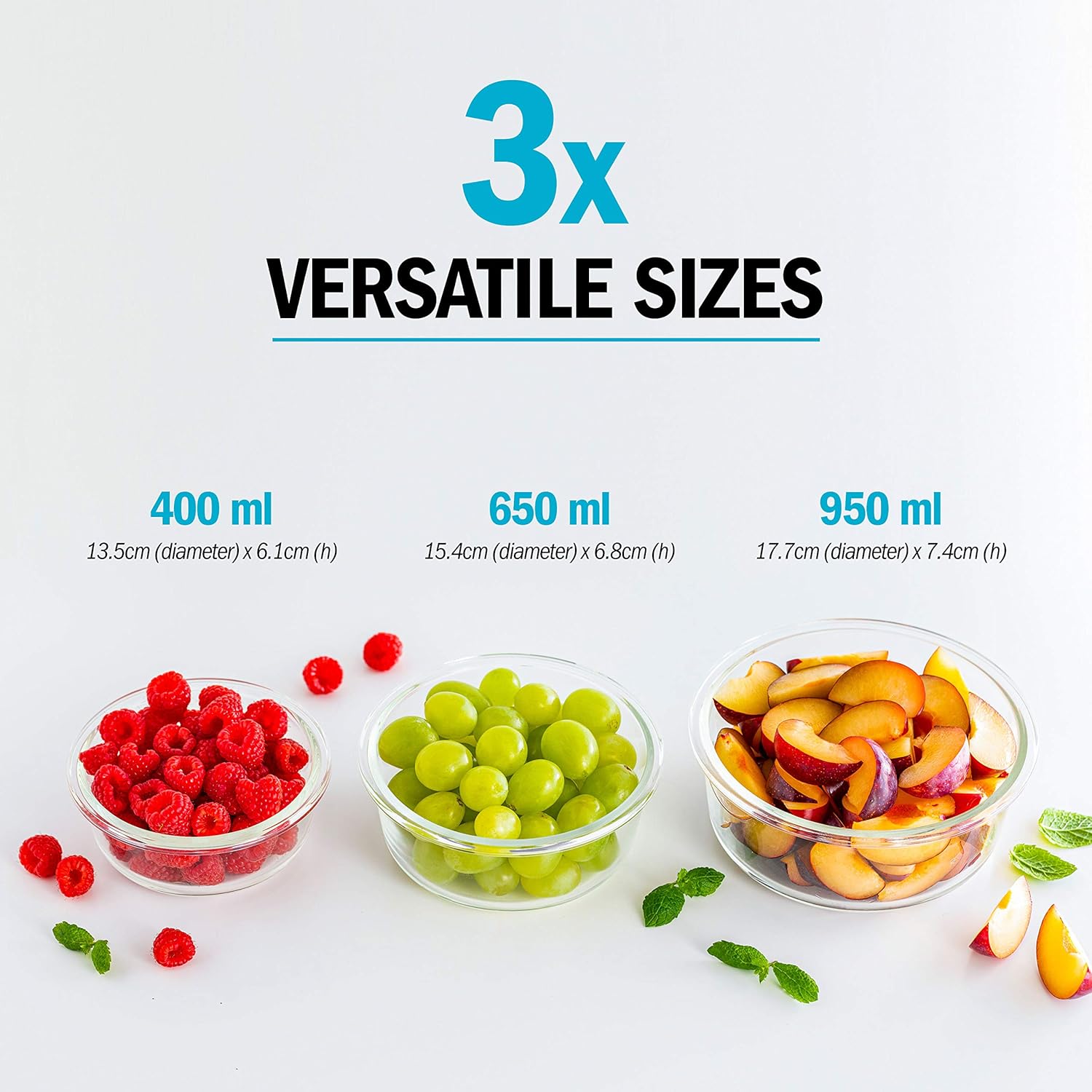 ★ ROUND MULTI-SIZED GLASS CONTAINERS ★ 3 versatile sizes, ideal for fruit, salad, snacks, soup and more. Nonporous glass won’t absorb food odours, flavours, or stains and BPA-free polypropylene lid is odourless, leaving food tasting just the way you prepared it. Container sizes: 400ml = 13.5cm (d) x 6.1 (h), 650ml = 15.4cm (d) x 6.8cm (h), 950ml = 17.7cm (d) x 7.4cm (h)