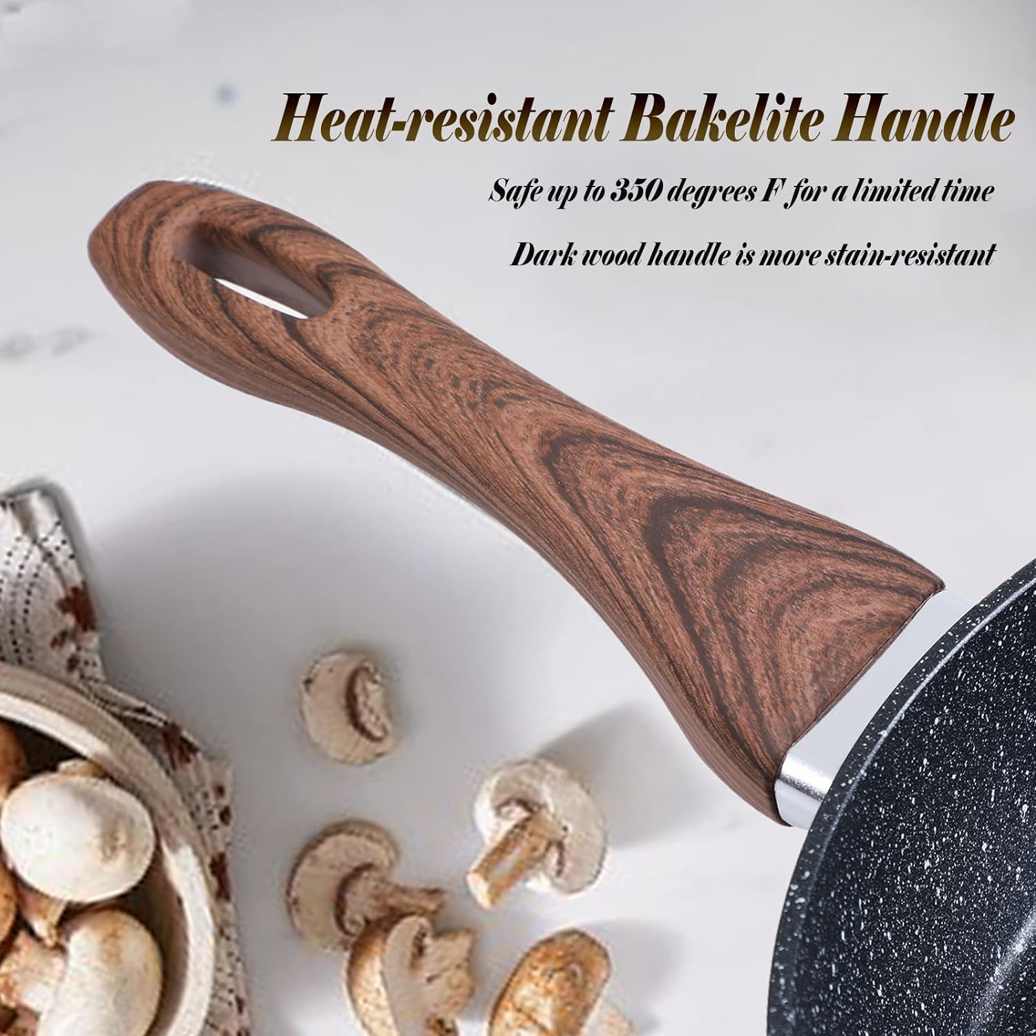🔥Pots and Pans with Bakelite Handle – Bakelite is used because it has heat-resistant properties and is an electrical insulator. Bakelite would not burn when exposed to high heat. Bakelite is safe up to 350 degrees F, for a limited time. Dark bakelite handle is more stain-resistant and easy to clean too.