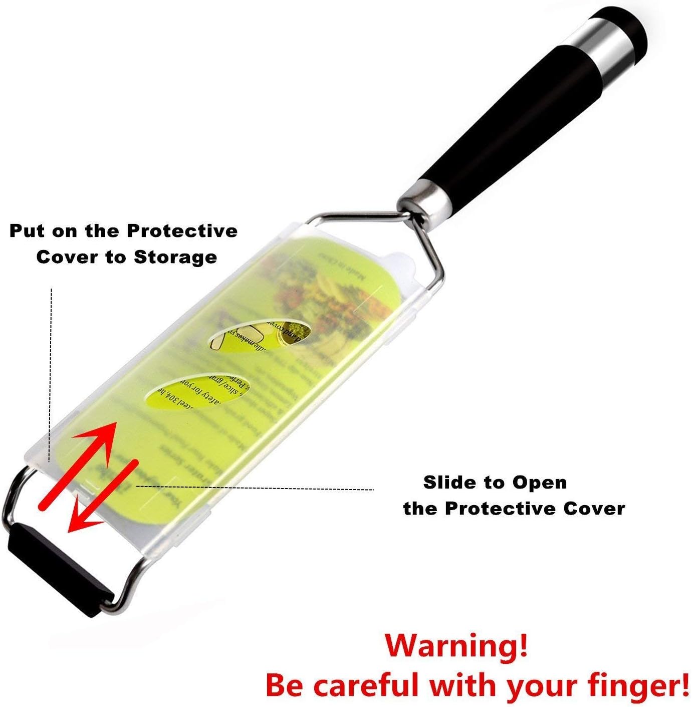 Cleaning and Storage: Dishwasher safe(excluding the sleeve) Store with blade cover after using, it will protect you from hurt while protect this grater