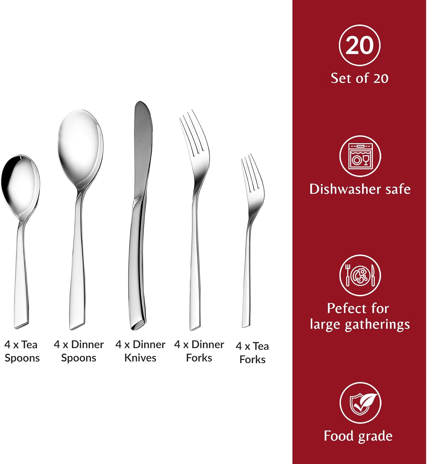 This comprehensive set includes 4 dinner forks, 4 dinner spoons, 4 dinner knives, 4 cake forks, and 4 teaspoons, ensuring that you have everything you need for a complete dining arrangement.Crafted with precision and attention to detail, these utensils boast a sleek and modern aesthetic that seamlessly integrates into any dining décor, this set is a valuable addition to your kitchen.Presenting a truly thoughtful gift, our meticulously crafted 20-piece set is an ideal choice for weddings, housewarmings, and various special occasions. Deliberately designed to infuse a touch of elegance and significance into memorable events