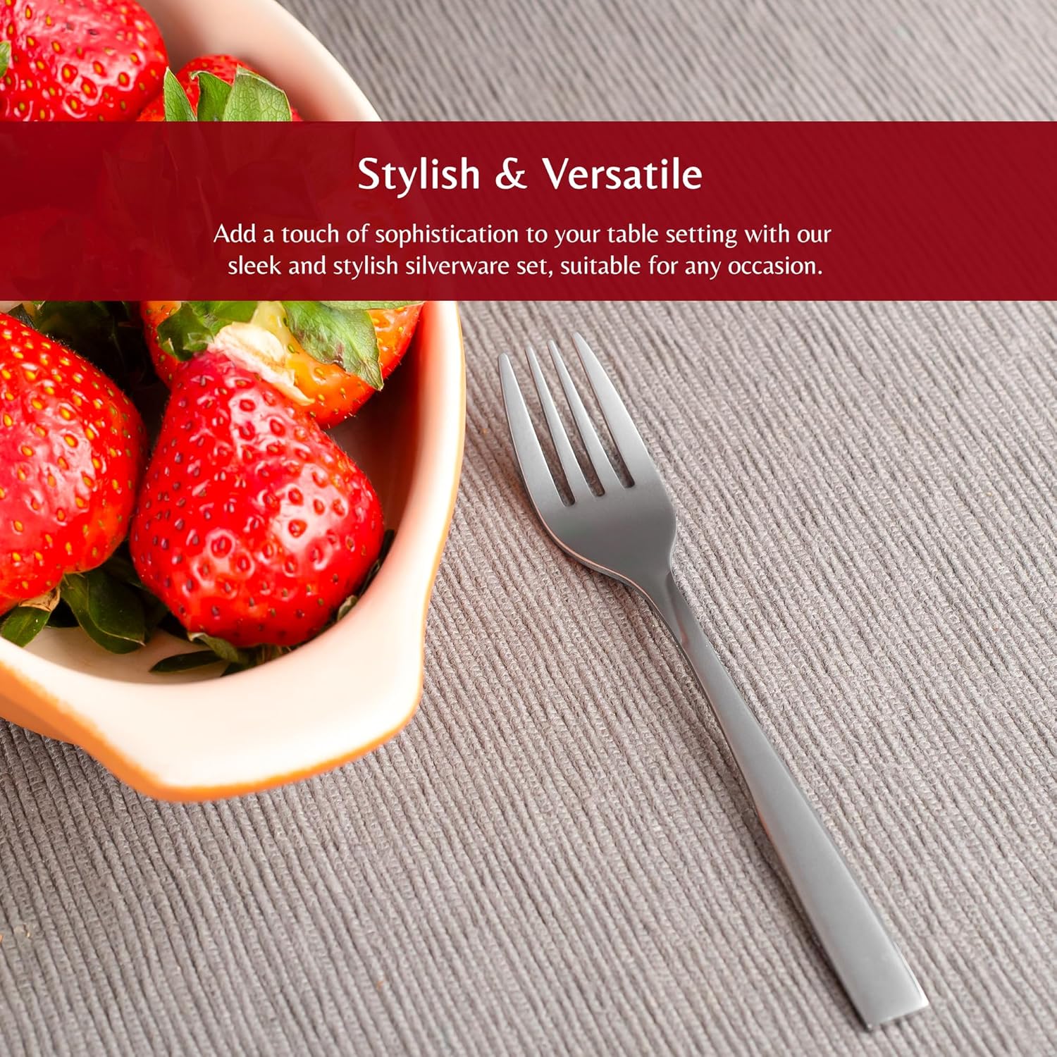 A perfect fusion of functionality and elegance, designed to enhance your dining experience. The set includes 4 Dinner Spoons: Impeccably designed with a perfect scoop, these spoons are your ultimate choice for savoring soups or stews, 4 Dinner Forks: Ideal for a variety of main courses or salads, these forks are perfect for family dinners, 4 Dinner Knives: Elevate your dining affair with these sleek knives, expertly crafted for precision cutting for your dishes, 4 Cake Forks: Transform dessert time into a moment of sophistication with these delicate cake forks. Perfect for sweet treats, 4 Teaspoons: Versatile and practical, these teaspoons are your go-to for stirring a hot cup of tea or adding a dash of sugar to your coffee.