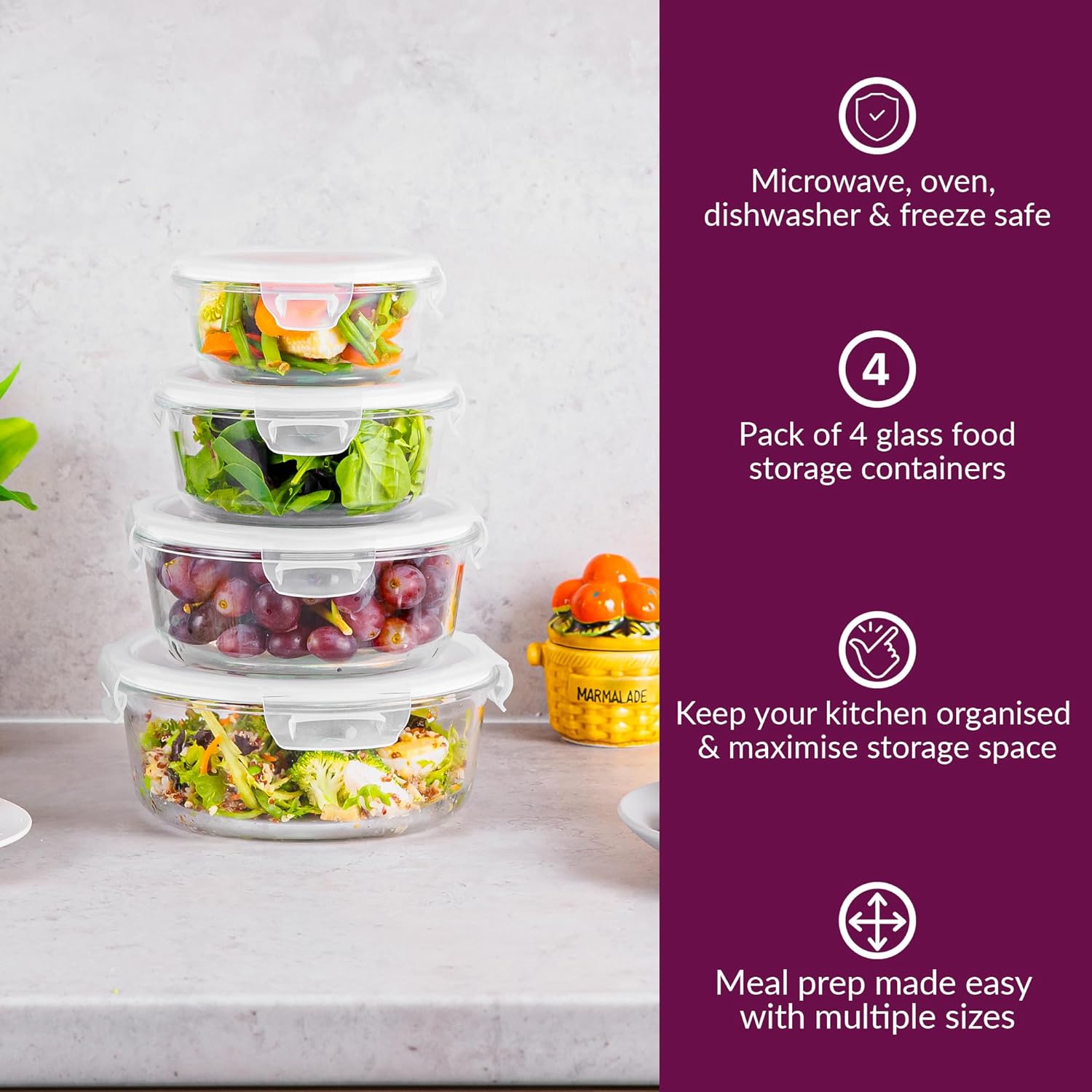 Innoteck Essentials 4pc Round Glass Storage Container Set with Snap Lock Lids – 4 pc glass food storage set with lids. This glass set comes in 4 sizes for use in the oven, microwave, freezer, and Dishwasher safe a stylish addition to any kitchen. Durable and hardwearing. This glass food storage set is made to last. Stack the Round tubs one on top of the other for neat and tidy kitchen storage or easy meal organisation in the fridge or freezer. This premium 4-pack of food storage glass containers with Air Seal lids will make it easier to prepare your daily dinner. The set comes in a variety of sizes, making it ideal for food prep, office lunches, ready-to-eat meals, portion control, and so on.