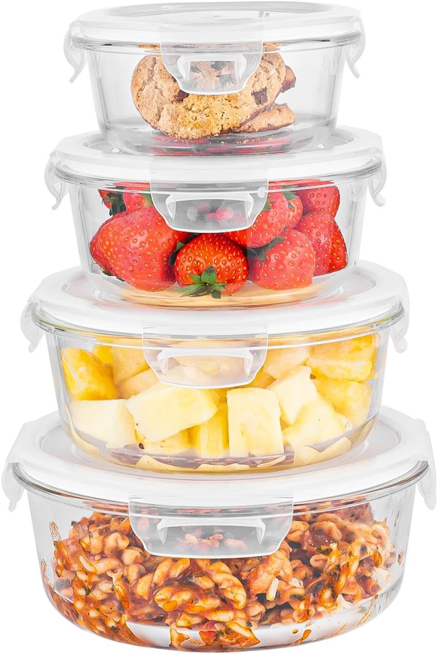 Innoteck Essentials 4pc Round Glass Storage Container Set with Snap Lock Lids – Watertight & Airtight Lids – Heat & Cold Resistant Glass – Microwave, Oven, Freeze & Dishwasher Safe – for Meal Prep