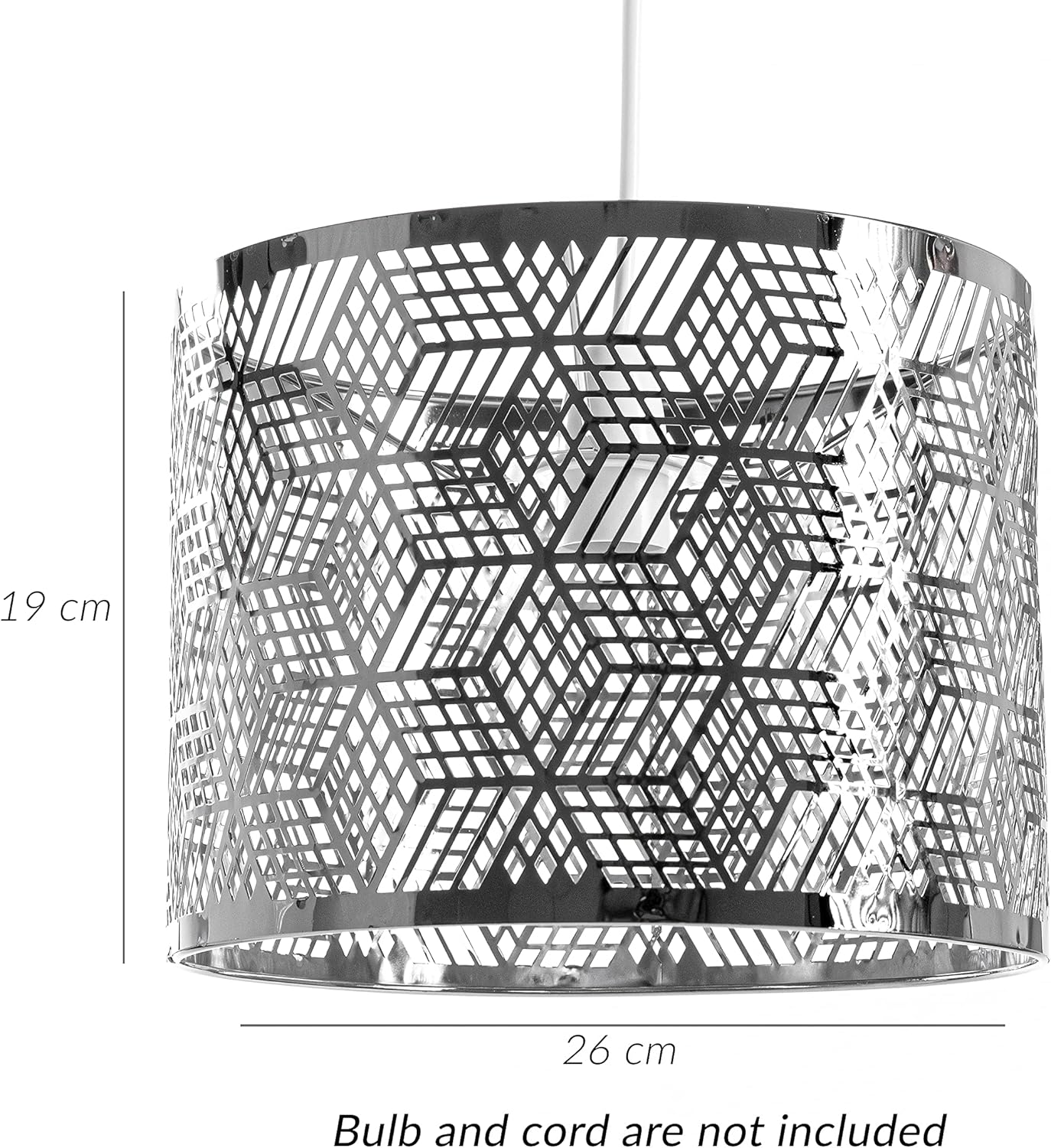 cool & modern, decorative chrome perforated metal drum shade with cube pattern cut-out. product size : dia 26cm x h 19cm.