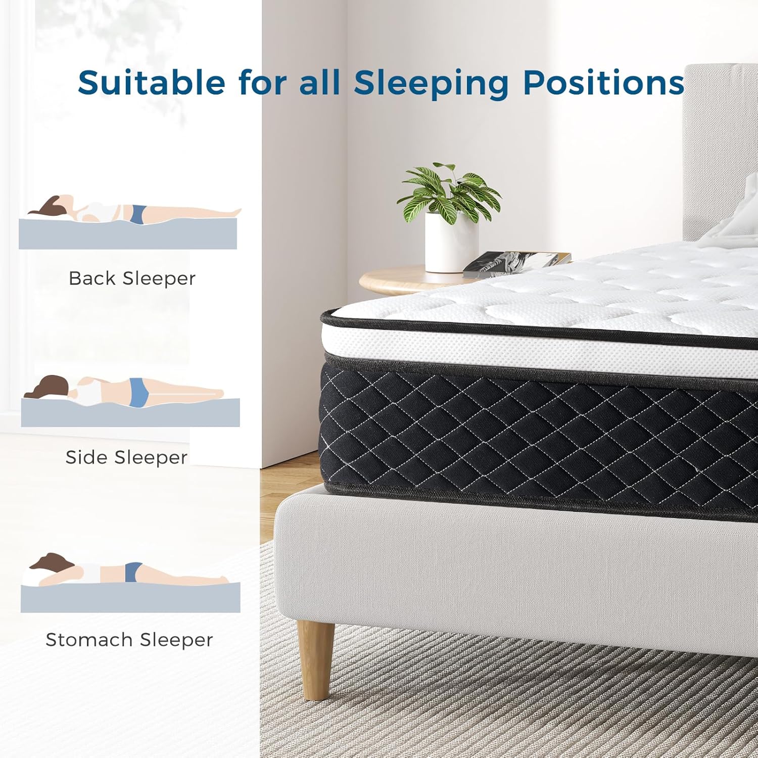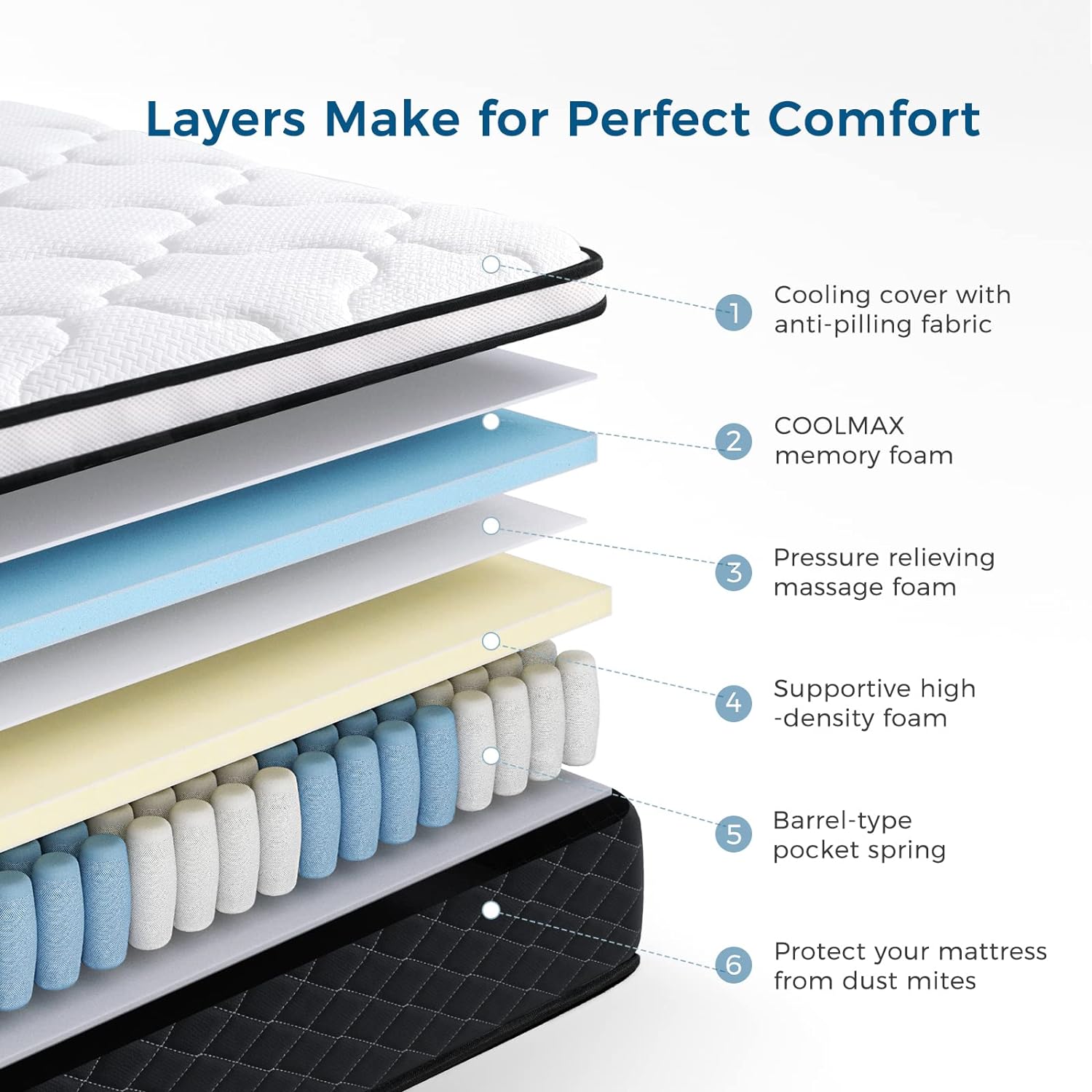 💤𝑨𝒃𝒐𝒖𝒕 𝑪𝒐𝒎𝒇𝒐𝒓𝒕 𝒂𝒏𝒅 𝑩𝒓𝒆𝒂𝒕𝒉𝒂𝒃𝒊𝒍𝒊𝒕𝒚:Mattress combines comfort and breathability by incorporating high-tech cooling molecules into the cool knit fabric.Pressure-relieving memory foam to softly wrap around you, highly supportive, gentle envelopment. Equipped with ultra quiet indepent pocket springs that provide point-to-point support,these elements will provide you with a nearly “perfect” customized mattress that also offers amazing value for money.Why not try?