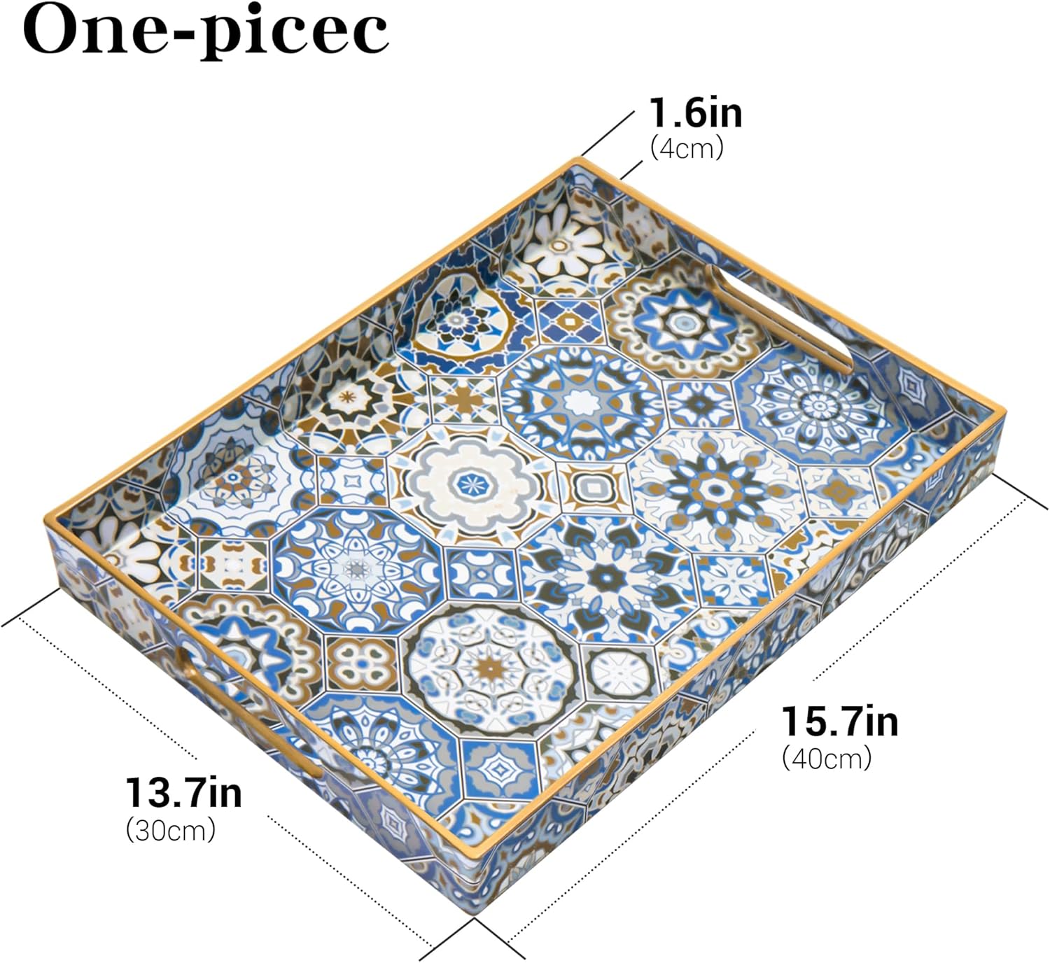 JANERIW Boho Decorative Tray, Rectangular Serving Trays with Handles, Large Tray for Ottoman Coffee Table, Modern Blue Plastic serving platter