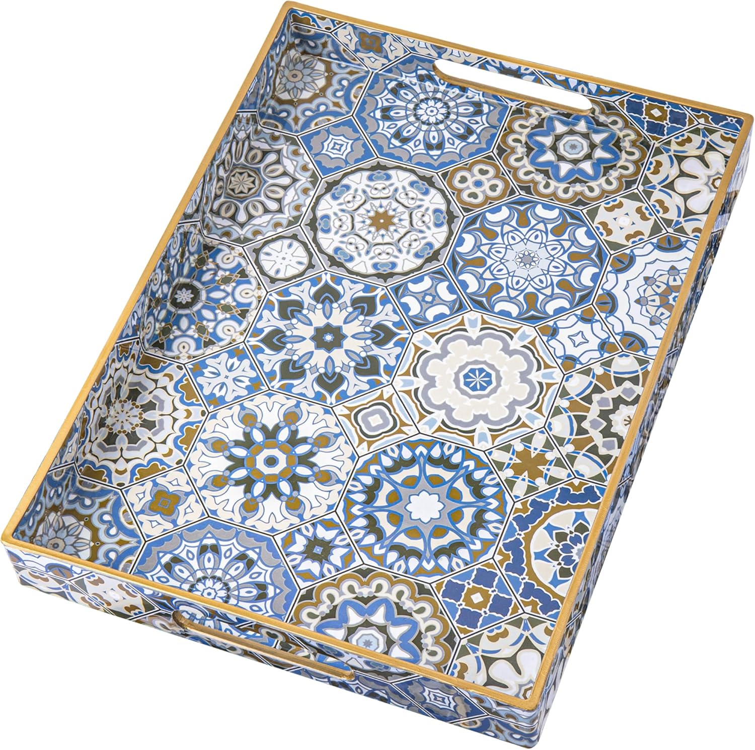 Blue Bohemian Large Rectangular Plastic Tray, Waterproof, Easier To Clean, Vintage Bohemian Style, Suitable For Any Home Decor, More Elegant, A Multi-Functional Serving, Breakfast And Decorative Tray Essential For Your Daily Life.
