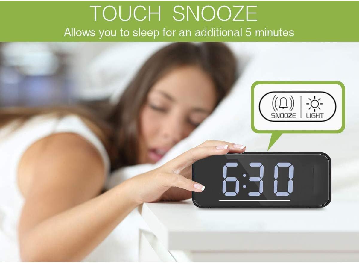 Multifunction Digital Alarm Clock: . / 4H mode. . Mirror surface function, Can also be used as a makeup mirror. . Temperature display (degrees Celsius Degree C / Fahrenheit Degree F). 4. Power by USB charging cable/ AAA batteries (not included). 5. Big LED screen, super slim, energy saving, clear boldface number display, easy to read. 6. Voice activation function, when the battery mode is used you can voice-activate the screen, or press any key to turn on the screen. 7. Adjustable brightness, The clock will automatically dim the screen at dusk and resume brightness at dawn ( 8: 00-06: 00) . 8. Alarm sound stronger gradually, sorftly wake you up from dreams. 9. 5 functional keys (ALARM, MODE, LIGHT/SNOOZE, UP, DOWN). 0. This is a good choice as a Festival gift for your family. . Compeletely silent, zero radiation. Good for sweet sleep and healthy body. Specifications: Material: High quality plastic Color: Black White Type: Square Digital Clock Size: 6×6× .5 CM (6. × . × Inch) Package Contents: x LED mirror clock x USB charging cable x User manual Warm Tips: . There is a protective film on the digital clock mirror screen, please remove it before using. . If digital alarm clock is running via using battery, the screen will light for 5 seconds and you can turn on the screen with the sound of clapping hands. . If you need to keep the time lighting all the time, please powered by USB cable.