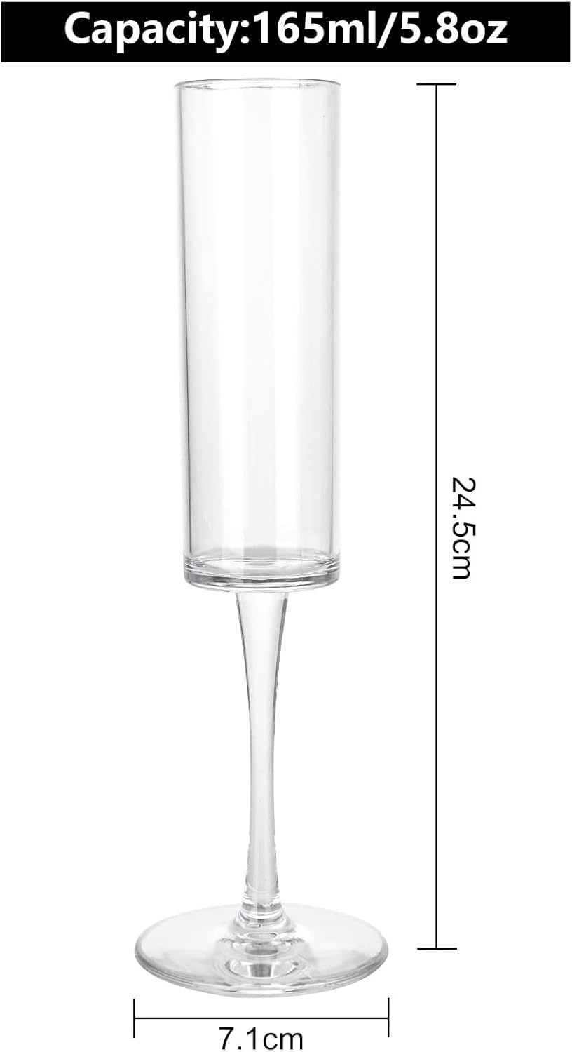 👍【PACKAGE INCLUDE】The package include 6 pcs unbreakable plastic champagne glasses, each one capacity is 165 ml/5.8 oz, size is 24.5 x 7.1cm, the caliber size is 4.4cm, perfect size for your daily use.