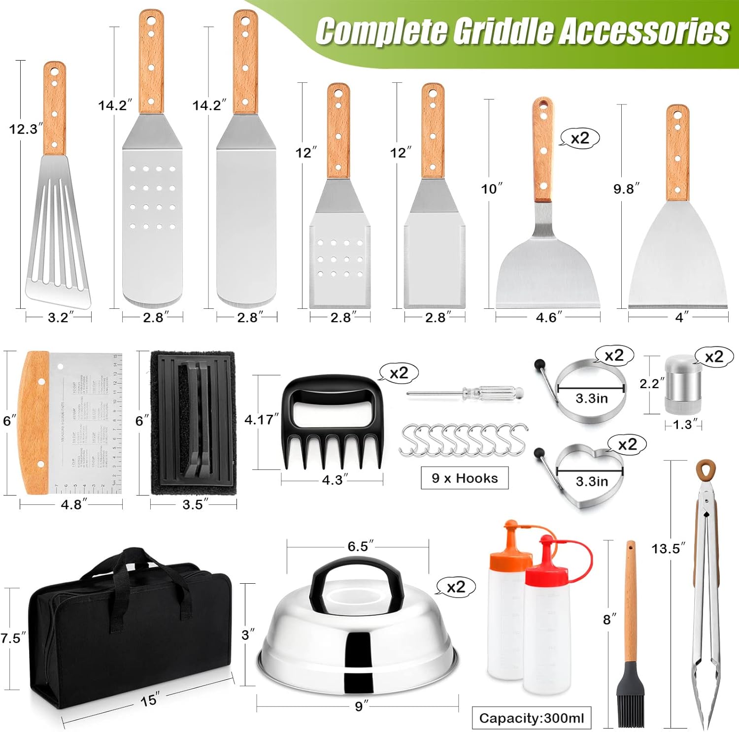 Joyfair 35Pcs Griddle Accessories Kit, Stainless Steel Outdoor BBQ Grill Tool Set with Melting Dome, Professional Heavy Duty Turner Spatula with Wooden Handle for Flattop Teppanyaki Camping Cooking