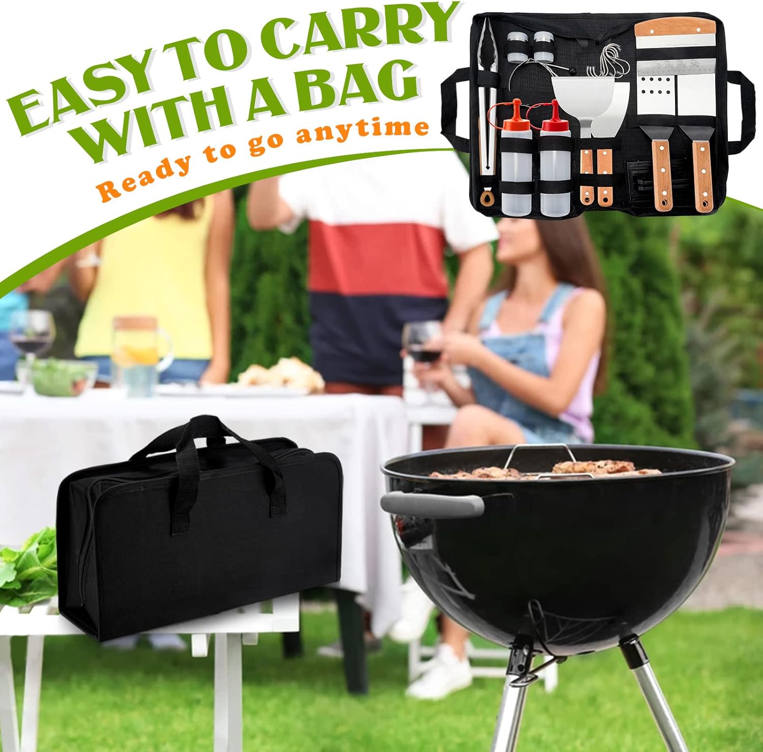 ENJOY YOUR GRILL: The commercial flat top grill accessories provides all your needs for backyard barbecue griddle cooking, which including: 2 Melting Domes, Long Griddle Spatula, Long Perforation Spatula, Small Griddle Spatula, Small Perforation Spatula, Fish Turner, 2 Metal Spatulas, Griddle Flipper, Griddle Scraper, Food Tong, 2 Meat Claws, 2 Squeeze Bottles, 4 Egg Rings, 2 Spice Shakers, Scourer, Basting Brush, Screwdriver, 9 Hooks, Carrying Bag