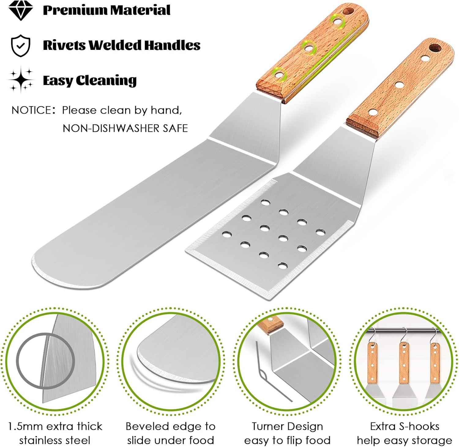 STURDY & DURABLE QUALITY: Joyfair griddle accessories are made of heavy gauge stainless steel, More durable for daily use, With extra 1.5mm thick steel and solid construction, Strong enough to hold heavier food without bending, Exquihttps://homeandgardentrends.co.uk/ wooden handle can withstand high temperature for keeping cool when cooking, No burrs for safe grasp and will not get fade or crack. (NOTICE: Clean By Hand, Non-Dishwasher Safe)