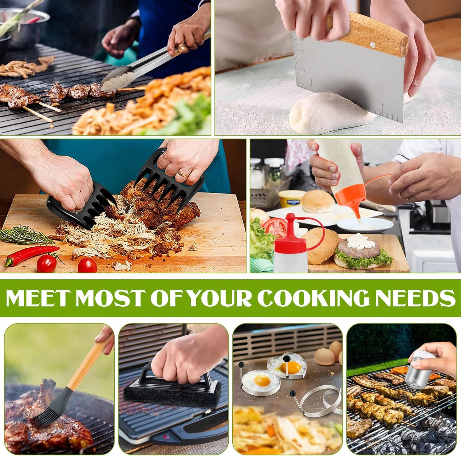 MORE TOOLS: 9 inch Cheese Melting Domes are perfect to cover multiple hamburger patties and large amount of veggies while reduce cooking time, No worry about hot oil splashing anymore, Meat claws easy to shred the meat or hold the food in place, 2 Squeeze Bottles with different color lid to help you distinguish your sauce instantly, A Scourer can help you remove stubborn stain after cooking