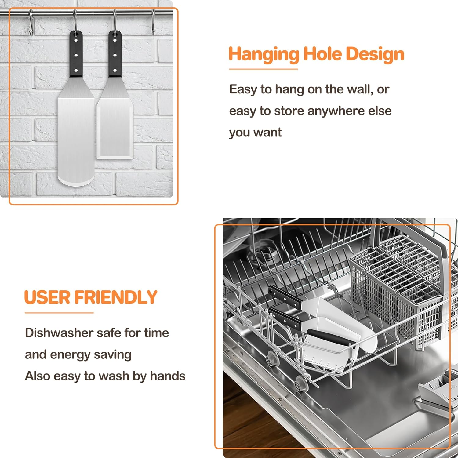 Joyfair griddle spatula sets are made of premium stainless steel, healthy for use. Heat-proof handle ensure safe use and frosted surface provide you a comfortable grip. Multipurpose hamburger turner fit as fish spatula turner, pancake spatula, bbq spatula, teppanyaki spatula, pizza spatula, etc.