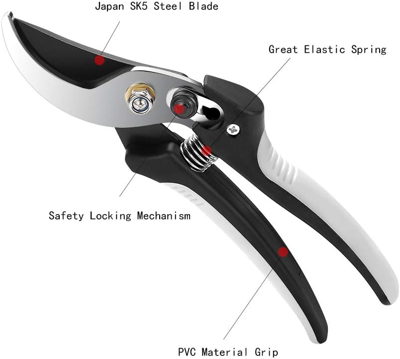 ✂【Pruning Shears】: Use Japanese SK-5 Steel blade is super durable and sharp enough. Fully hardened, precision-ground steel blade stays sharp, even through heavy use. The Pruner has a hardened steel blade that stays sharp.