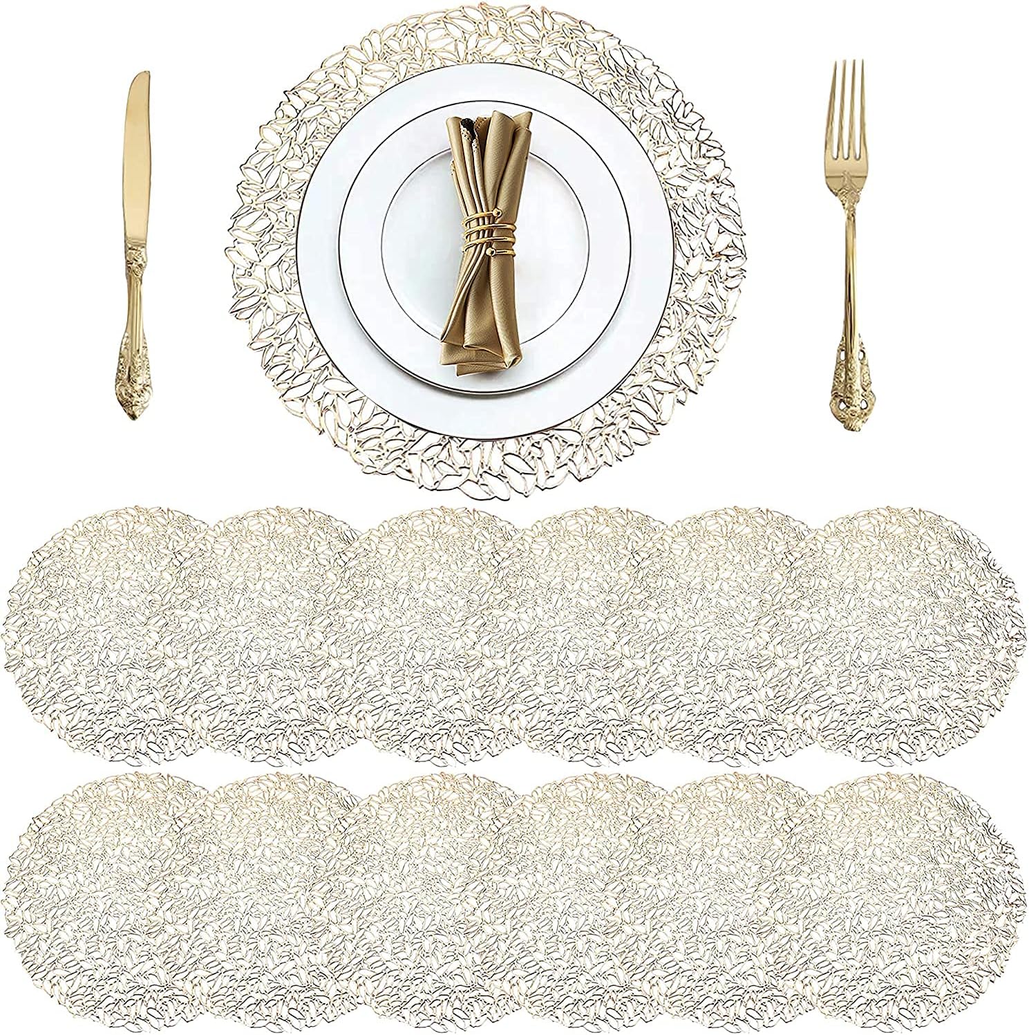 Include 12 pack gold round vinyl placemats, made of high quality PVC, well made, very durable.