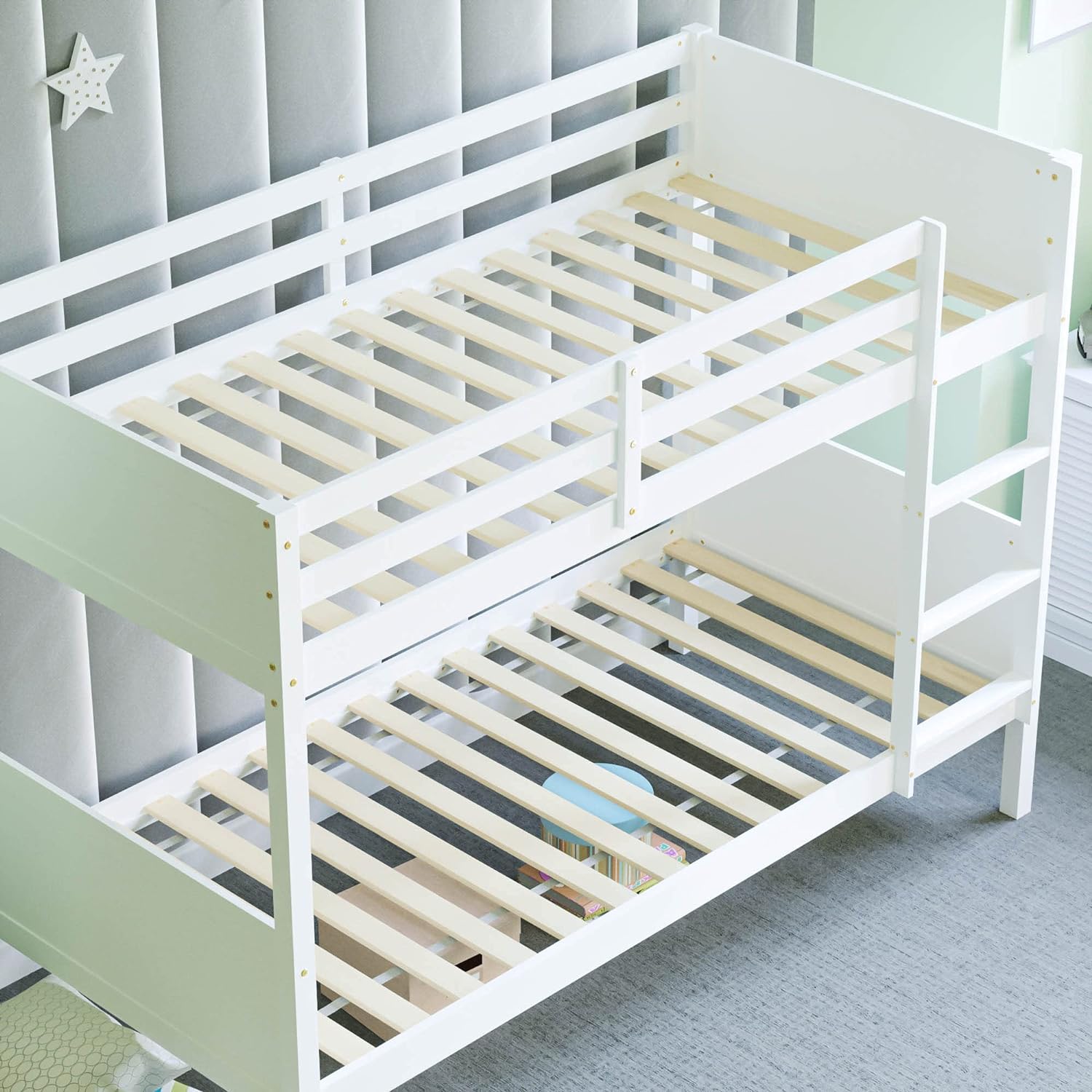 Gemini detachable bunk also features an adjustable ladder which can be positioned on the left or right side of the bunk. Built with safety in mind, this bunk bed includes full length guardrails on the top bunk to prevent child from falling.