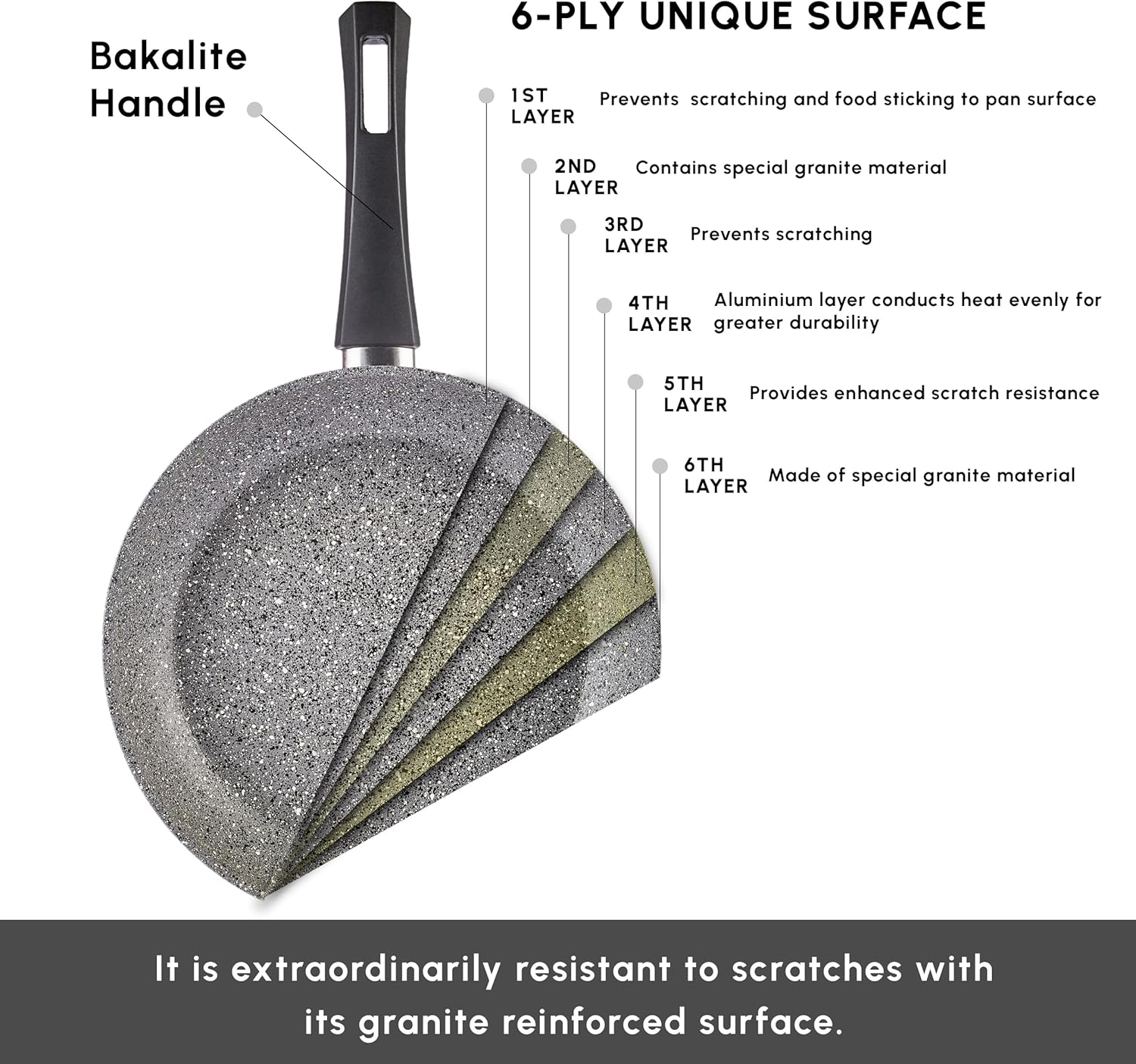 Innovative Biogranite Material: The cookware set features 6 layers for exceptional durability and safety, including surface protection, granite material, scratch prevention, even heat distribution via an aluminum layer, enhanced scratch resistance, and an additional granite layer with a PFOA-free cooking surface.