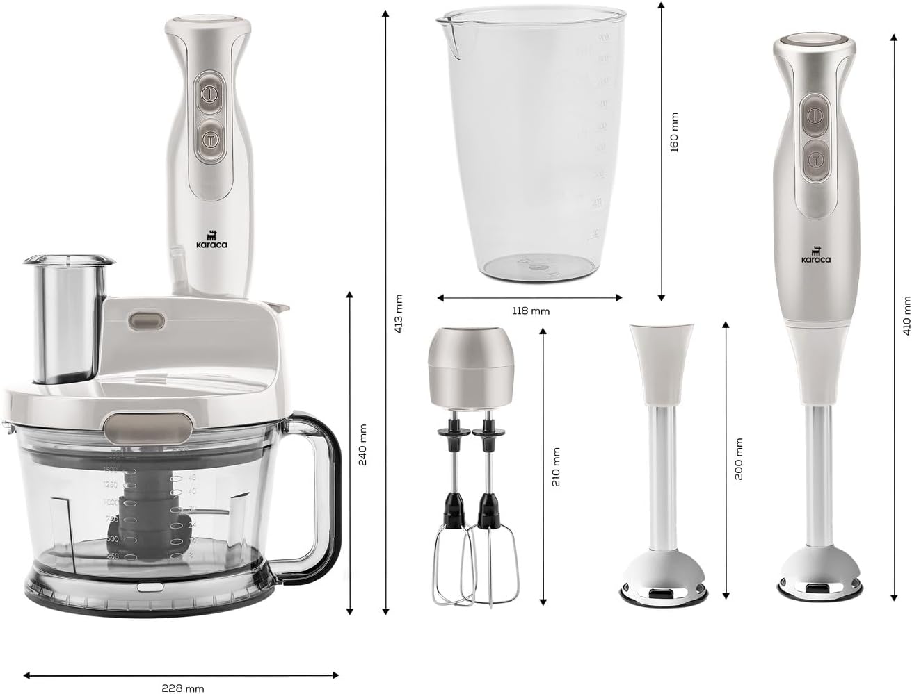You can easily chop meat, onions, vegetables and fruits with double-sided stainless steel chopping blades.Thanks to the dual steel mixer tips, you can quickly prepare cake batter, cream, baby food, mayonnaise, milkshakes, etc.