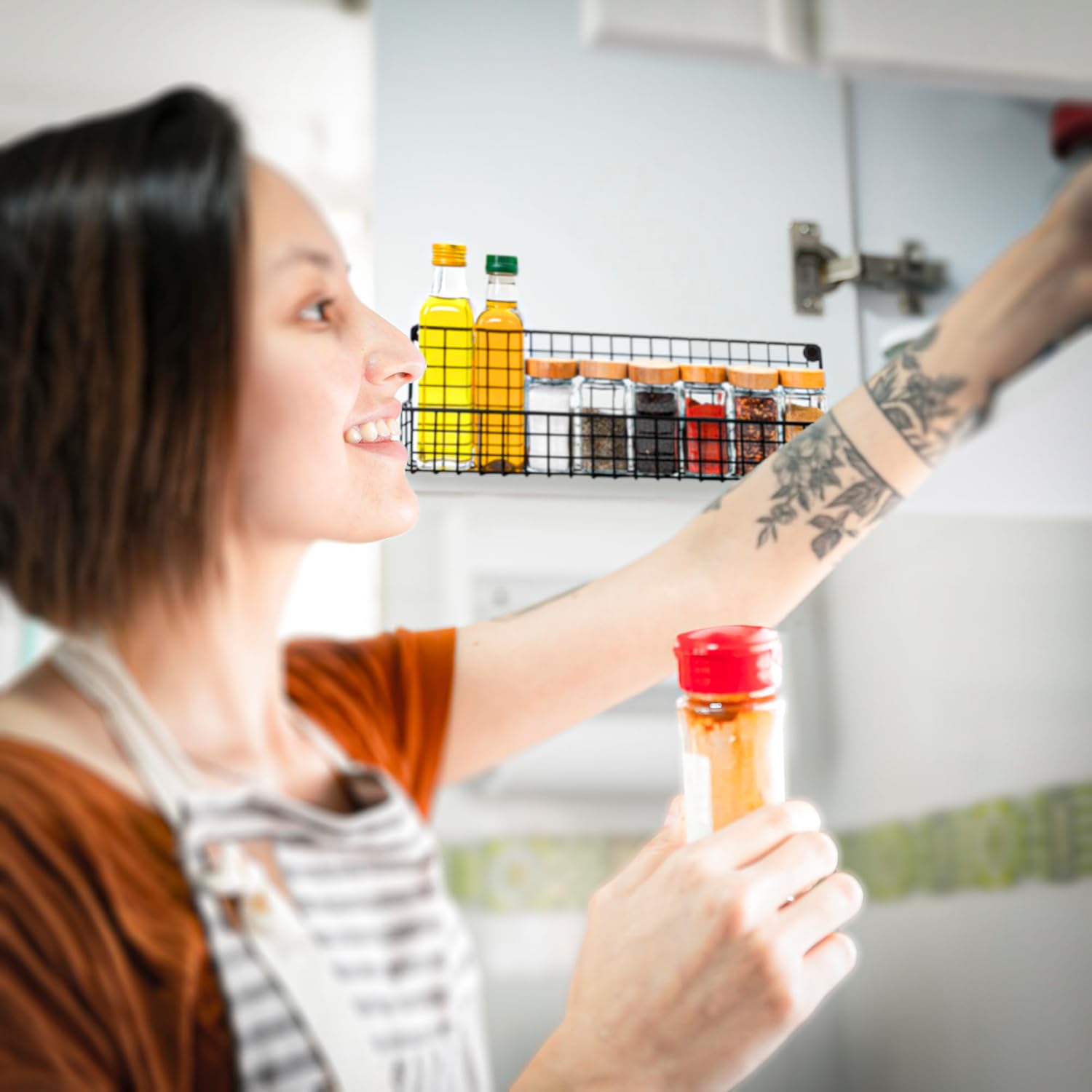 USE ON YOUR CABINET DOOR, WALL OR FIRDGE SIDE: This stylish black spice rack is a versatile kitchen storage solution that can be used as a seasoning organiser on your cabinet door, on the kitchen wall, as a fridge side shelf storage or as a small floating shelf.