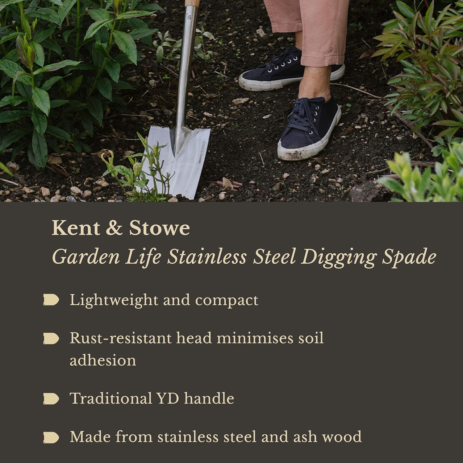 Kent & Stowe Garden Life Stainless Steel Digging Spade, Light and Compact Traditionally-Styled Garden Spade, All Year Round Garden Tools Made from Stainless Steel and Ash Wood