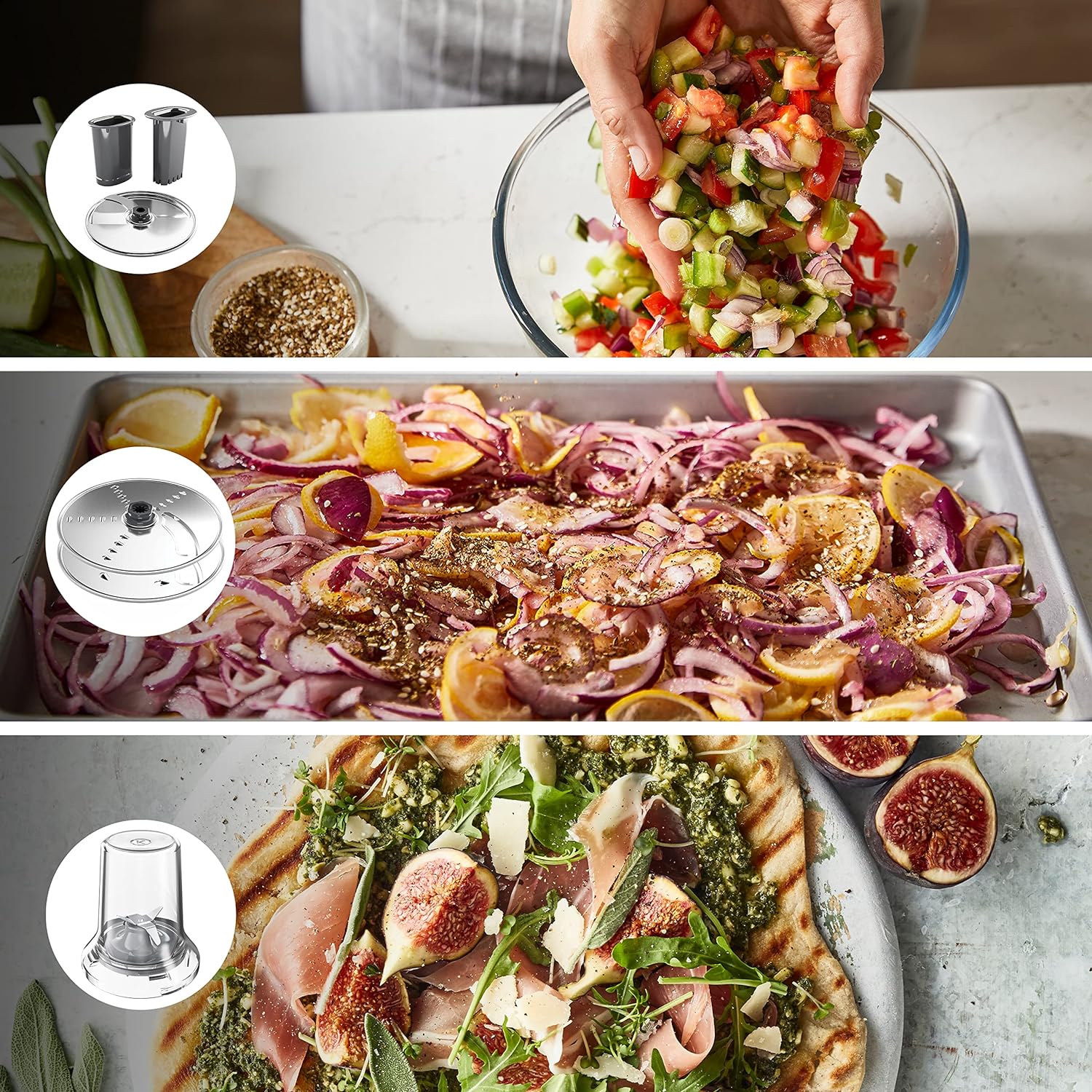 9 attachments including multi mill, slicing/grating discs, dough tool, duo feed tube and serrated knife blade