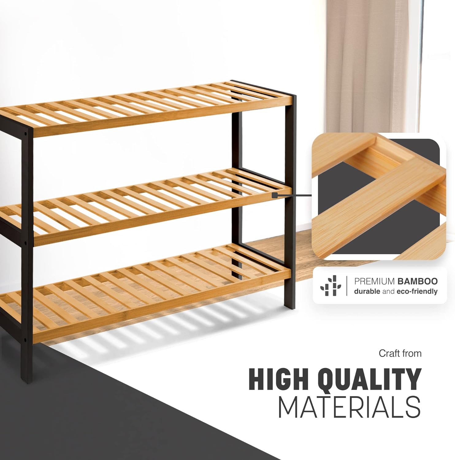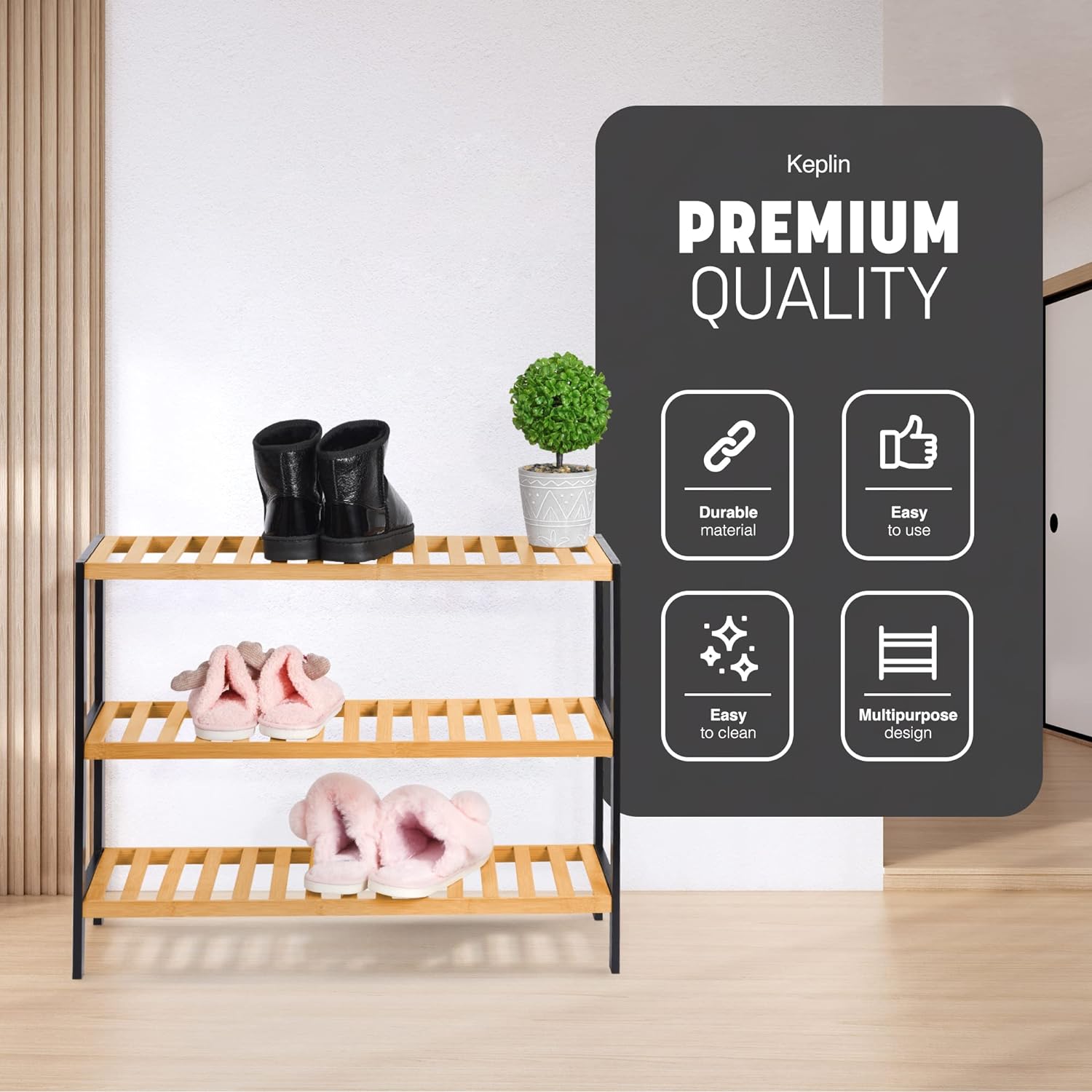 KEPLIN 3 Tier Natural Bamboo Shoe Rack Easy Assembly & Strong Design Shelf Organiser Ideal for Bedroom,Bathroom,Hallway & Small Spaces Large Capacity Up to 12 Pairs of Shoes(55x70x25cm)